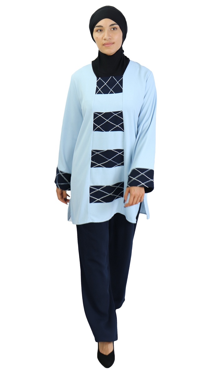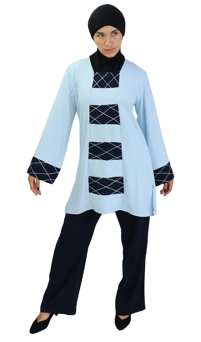 Ensemble (tunique-pantalon) en lin. Pantalon droit très facile à porter, taille élastiquée. Tunique fluide, encolure carrée, manches longues.