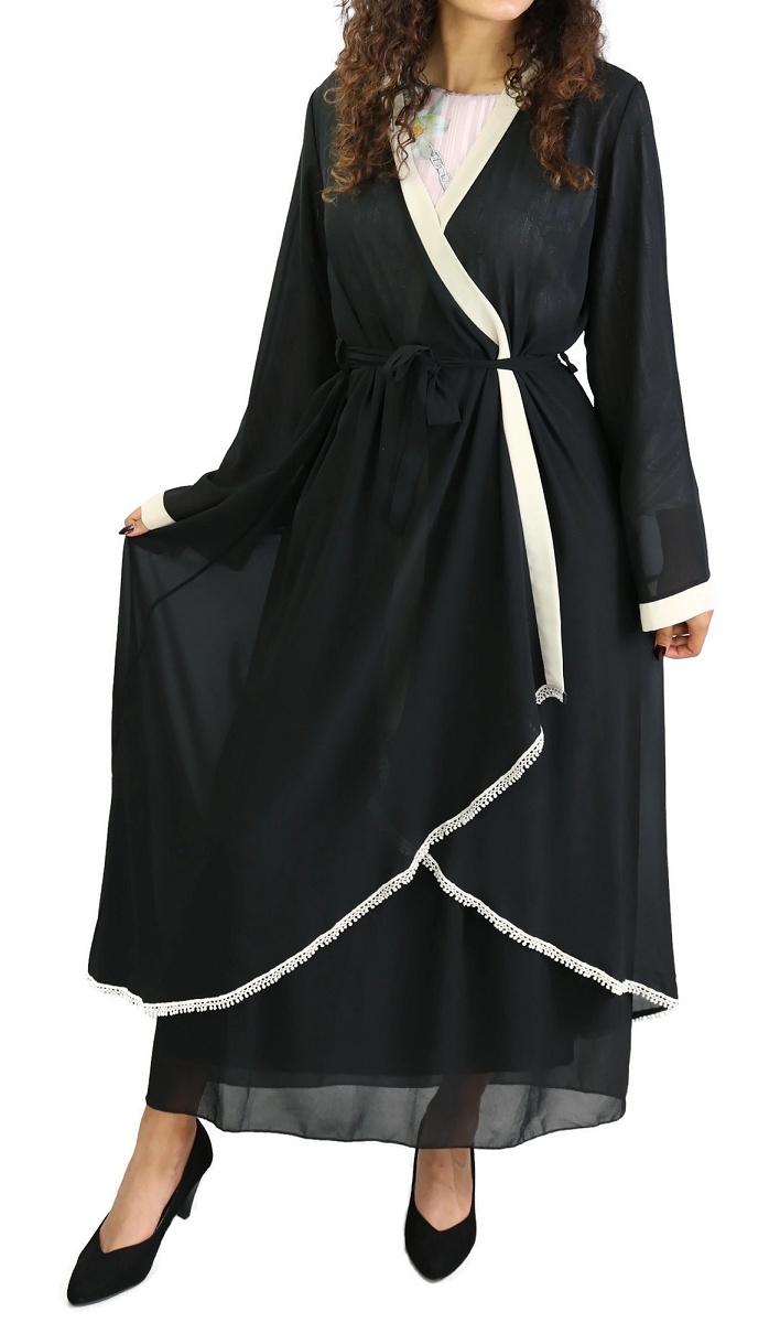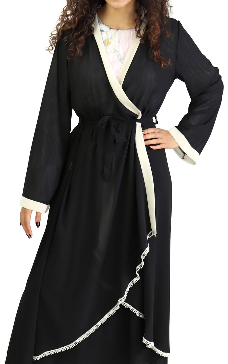 Kimono croisé avec bordures noires et dentelle. Longueur plus importante à l'arrière.
