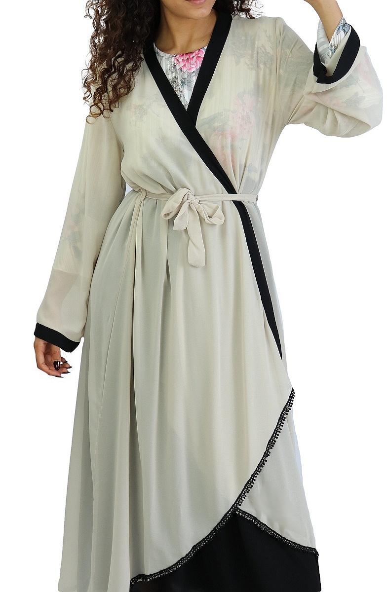 Gilet Veste longue col châle manches à froufrou (Vetement mastour en ligne pour femme voilée) - Couleur Kaki - REF. 33932 (25.00 €)