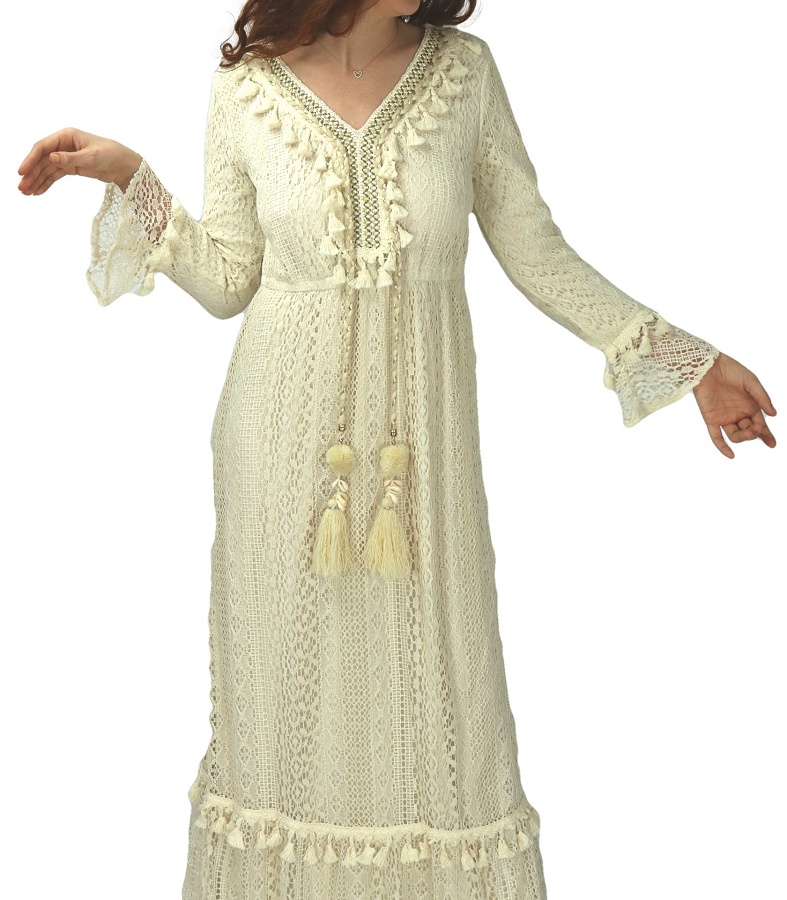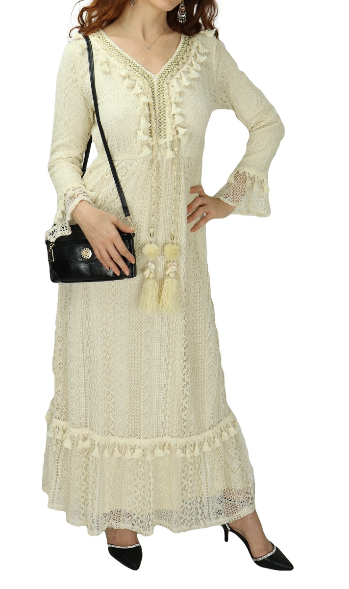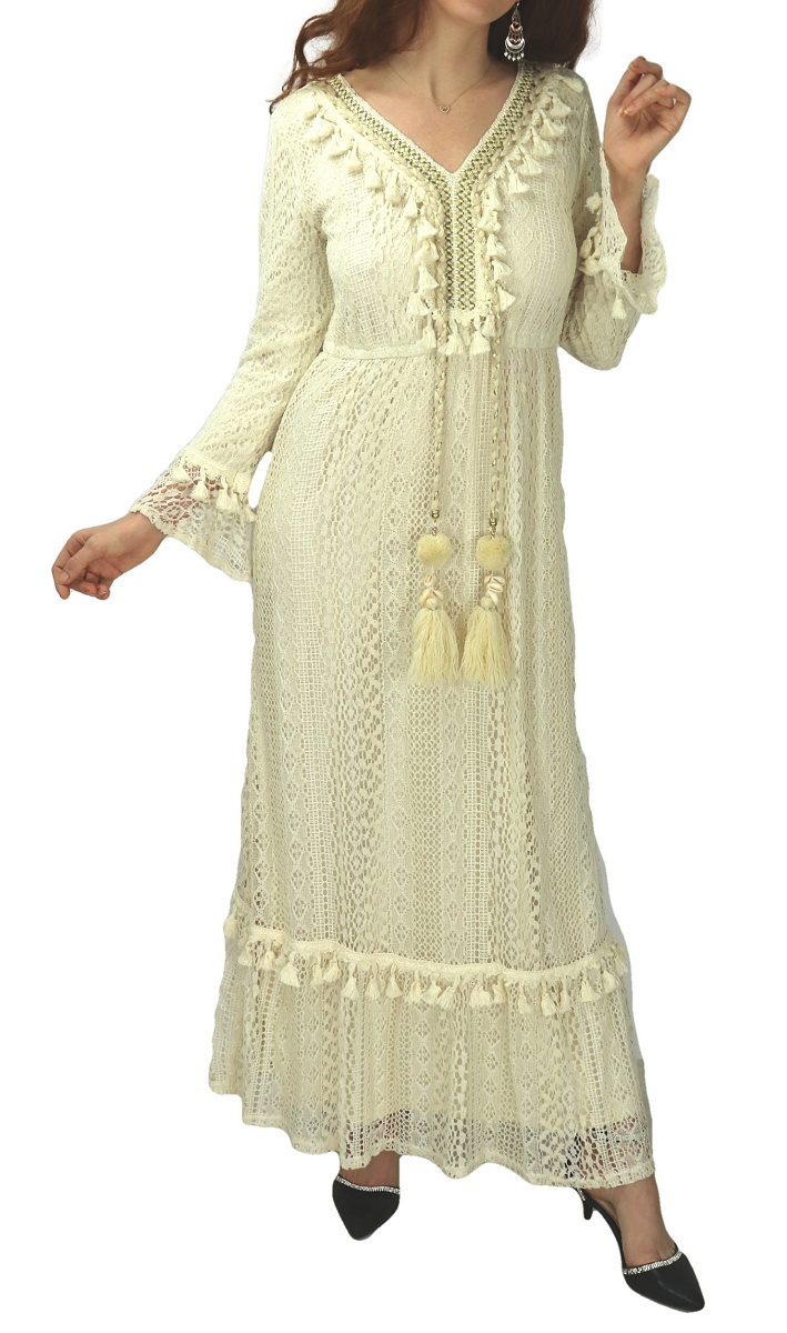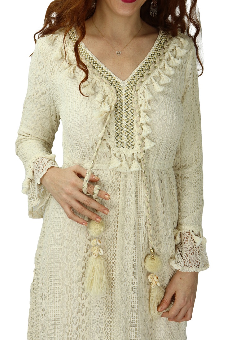Robe chic et élégante en dentelle super tendance avec doublure, col en V, broderies variées. Cette pièce se démarque avec ses pompons et coquillages sur ses cordons décoratifs.
