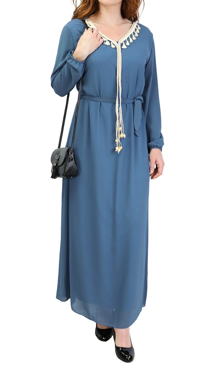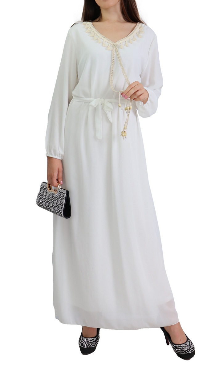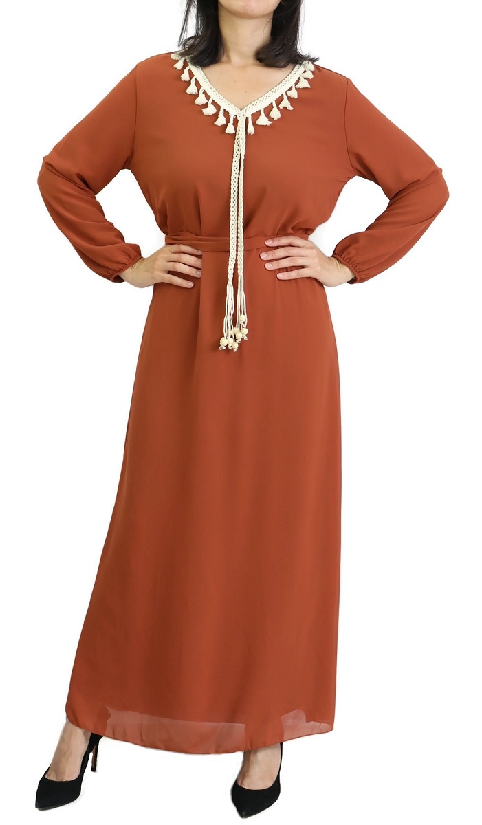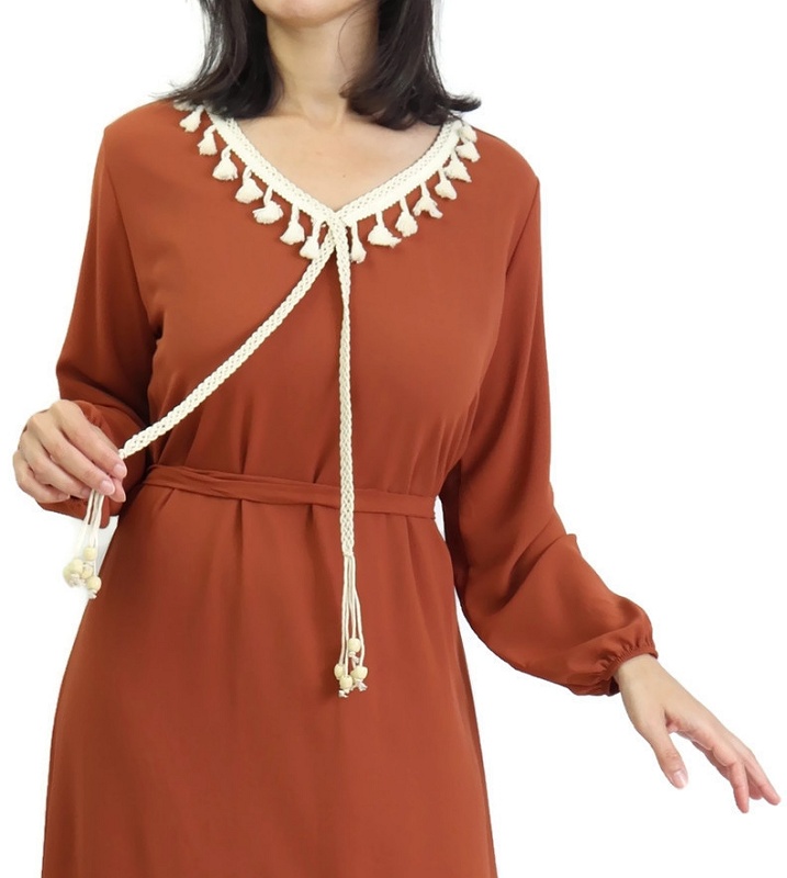 Robe col V entièrement doublée ornée de cordons beiges tressés, avec une jolie ceinture fine à nouer autour ou par derrière pour un effet cintré. Robe entièrement doublée. Tissu de type mousseline.