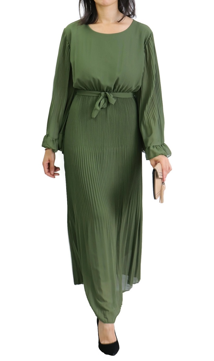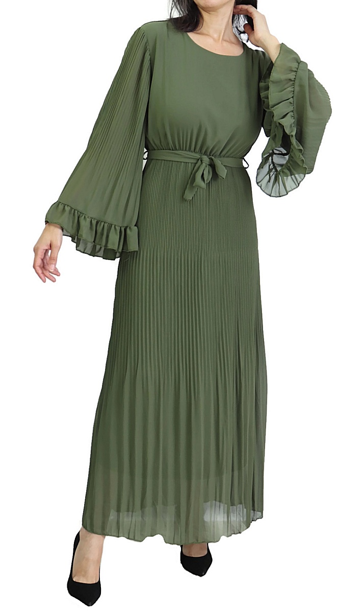 Robe longue ajustable à la taille. Plissée en bas de la robe ainsi que sur les manches évasées, le tout accompagné d'une ceinture qui peut se mettre autour ou par derrière. Intérieur doublé. Tissu de type mousseline.