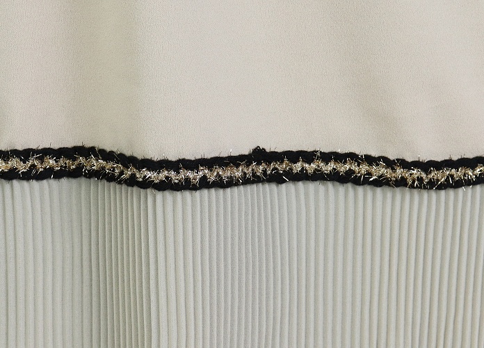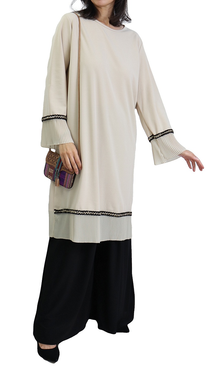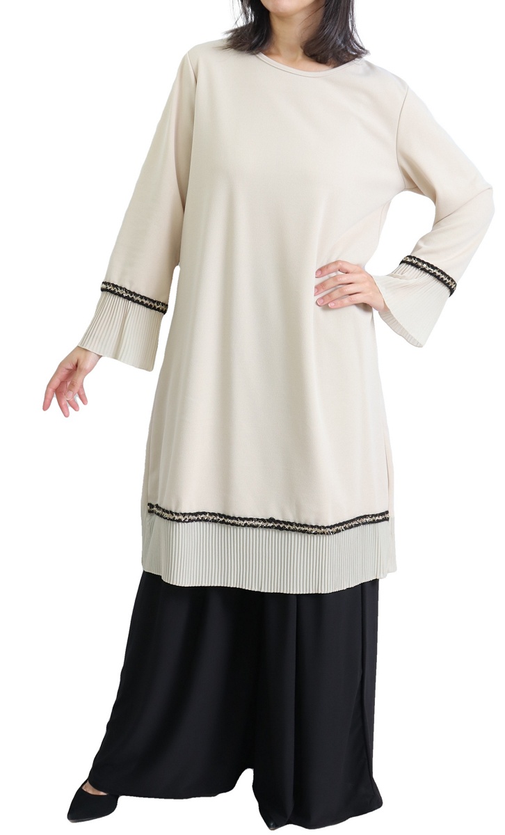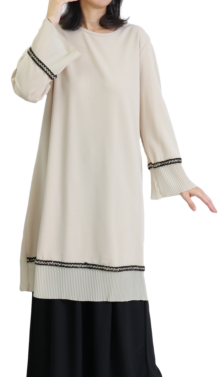 Tunique ample col rond, toutes saisons, plissée au niveau des manches et du bas. Bandes noires tressées pailletées. Tissu opaque.