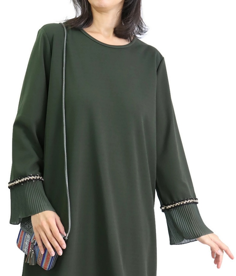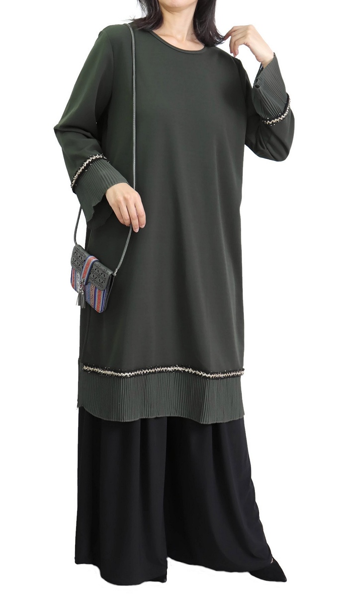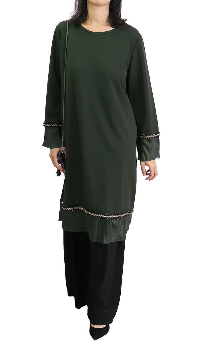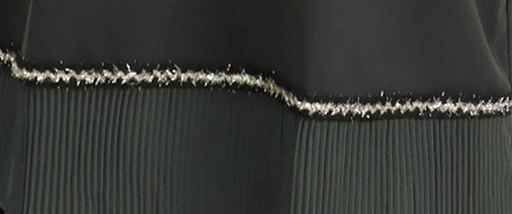 Tunique ample col rond, toutes saisons, plissée au niveau des manches et du bas. Bandes noires tressées pailletées. Tissu opaque.
