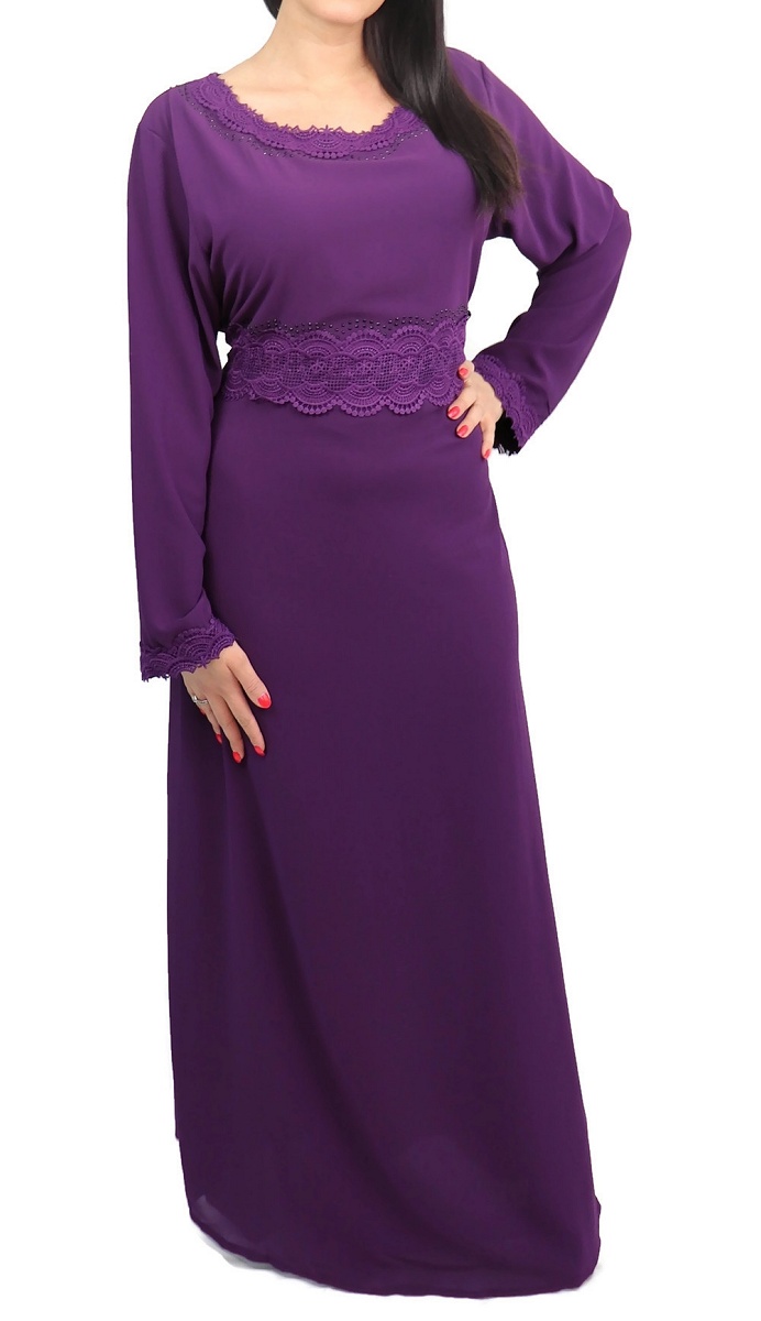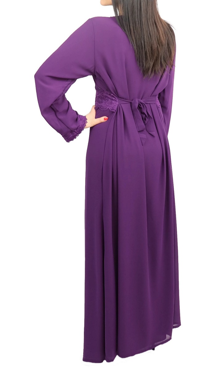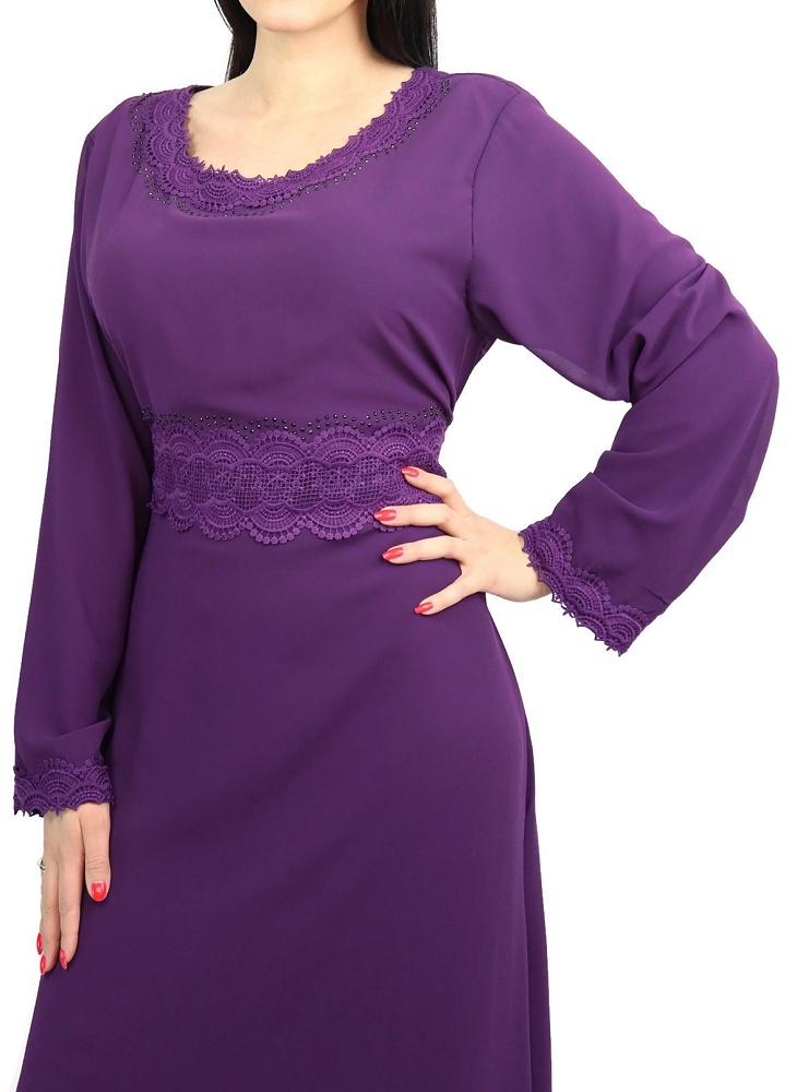 Robe à dentelles et strass sur un col dégagé ainsi que sur la taille et les poignets. Intégralement doublée. 2 liens qui peuvent aussi bien se nouer à l’avant comme à l'arrière afin de faire un effet cintré. Ce modèle sobre et distingué vous conviendra pour différents événements.