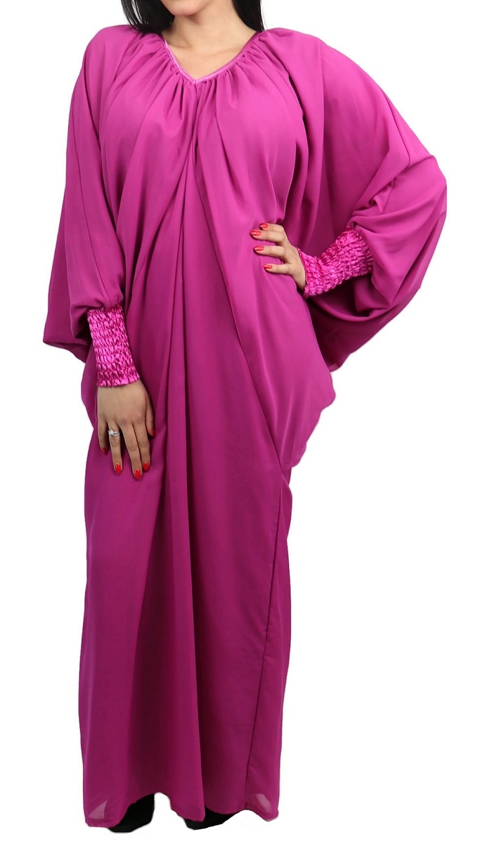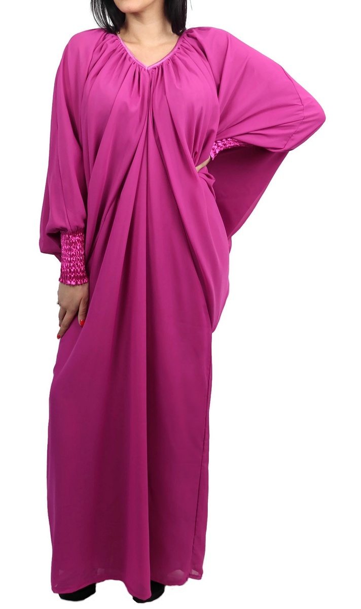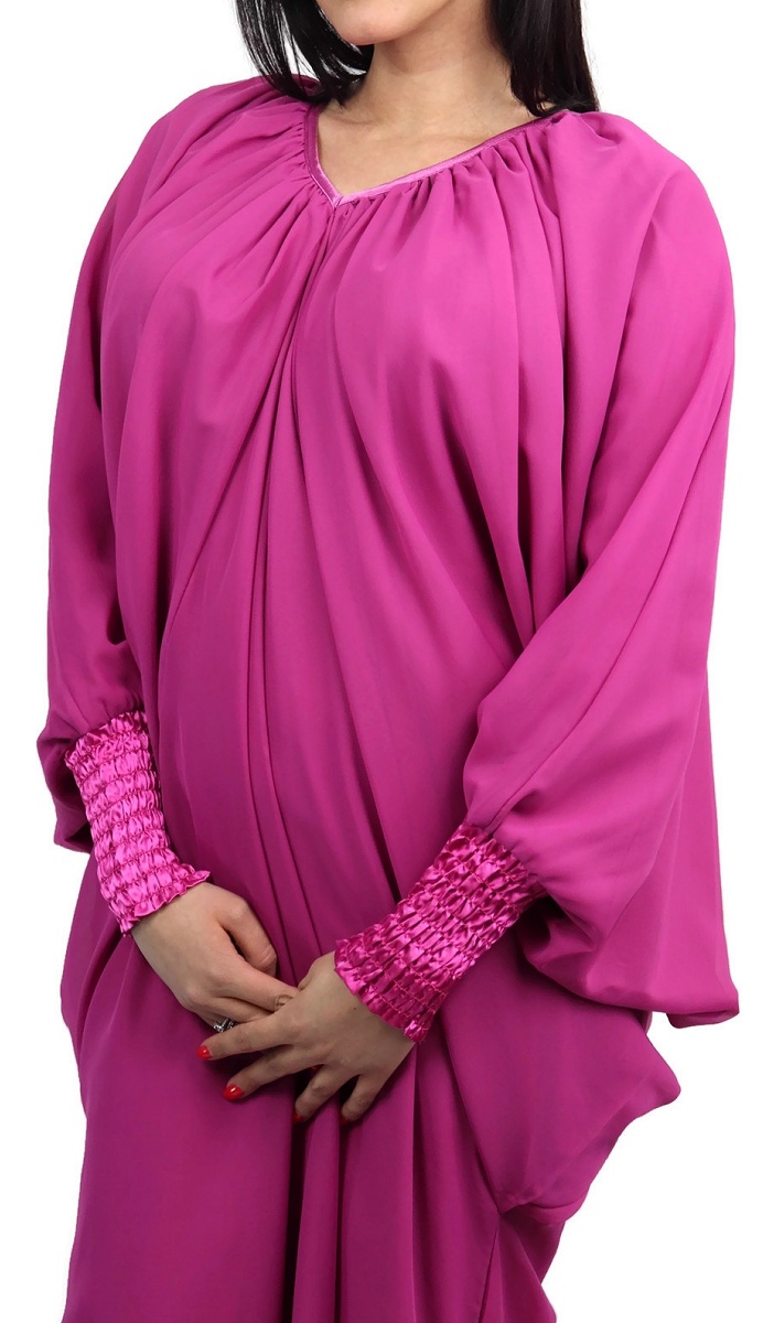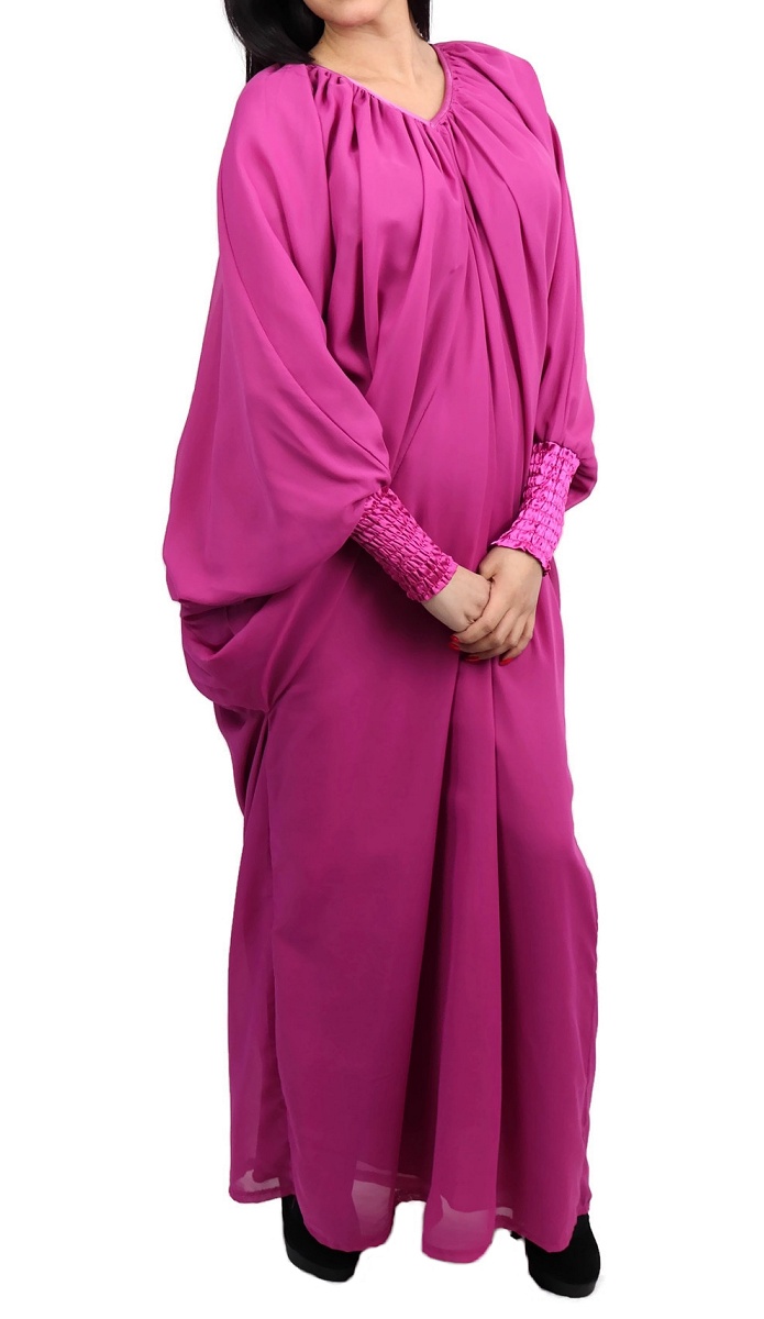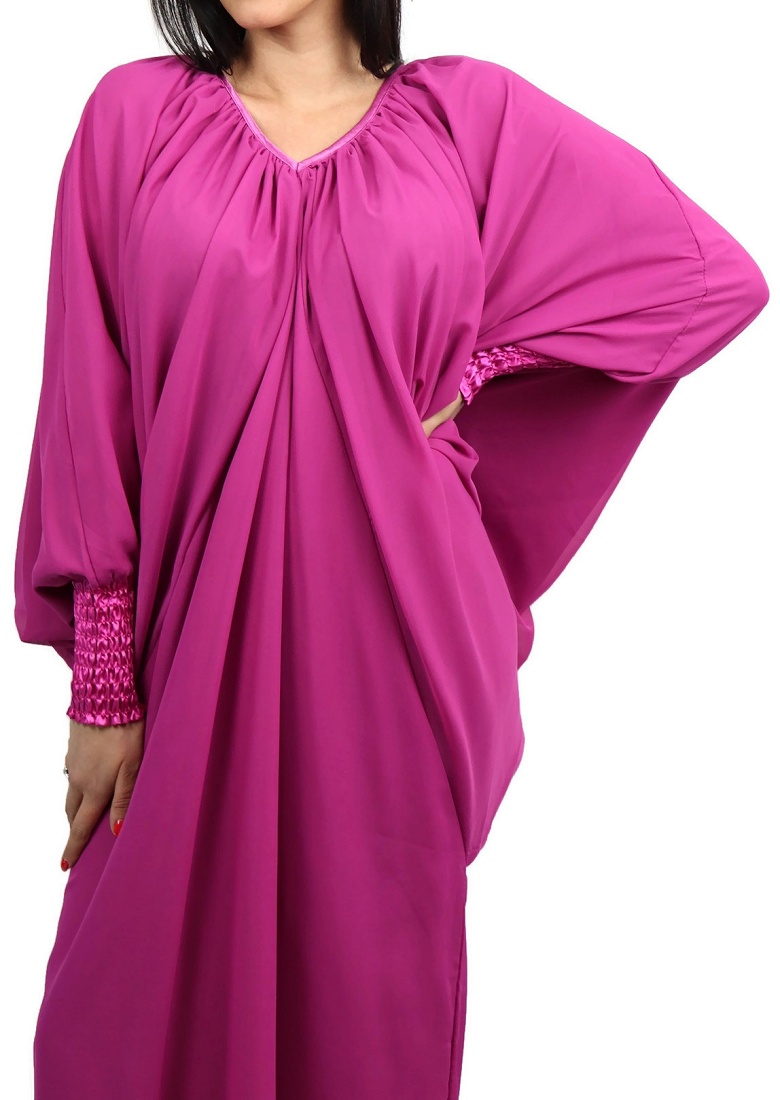 Robe confortable et habillée . Col en V satiné, manches amples resserrées aux poignets par une bande élastique froncée et satinée. Tissu léger style "organza" accompagné d'une doublure. Coupe papillon en haut et droite au niveau des hanches.