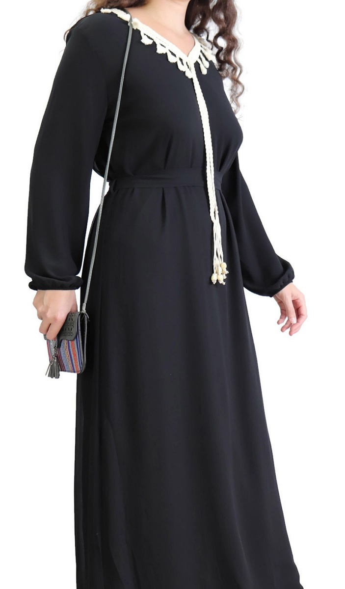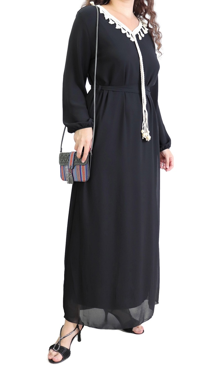 Robe maxi-longue fluide avec cordons à pompons pour femme - Couleur Noir Vetement & Accessoire