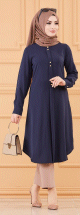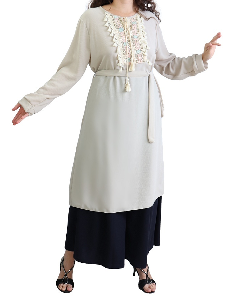 Tunique à pompons brodée, col rond doté de cordons, avec sa ceinture assortie, matière légère et agréable à porter .