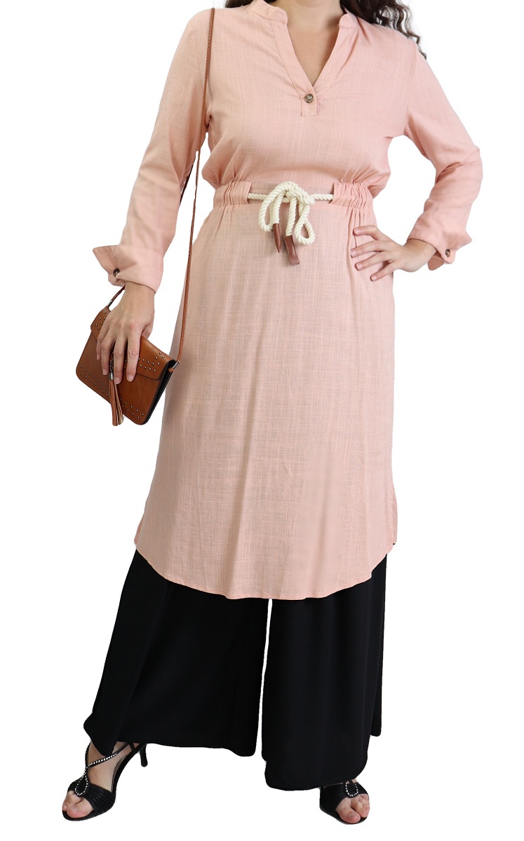 Tunique composée de lin et de coton très agréable à porter. Manches à revers boutonnés, col tunisien ouvert et belle cordelette blanc cassé au niveau de la taille.