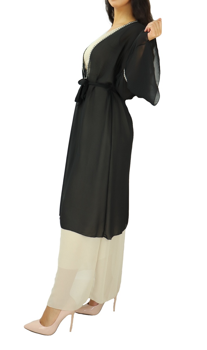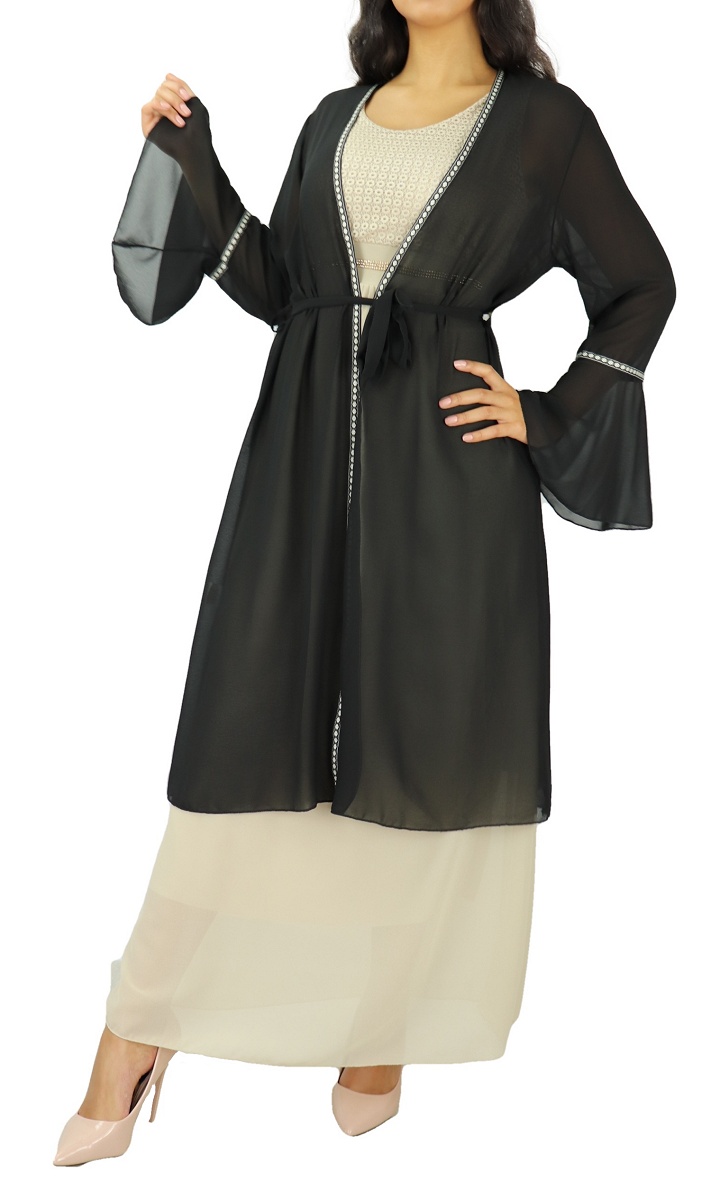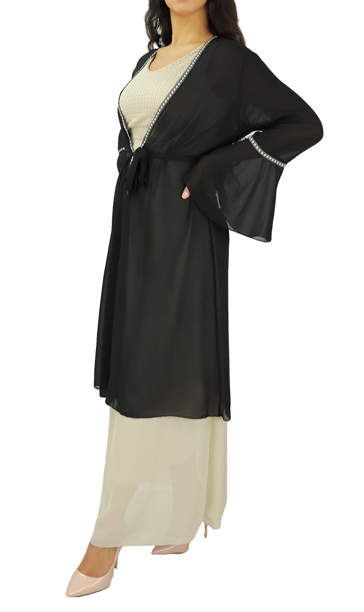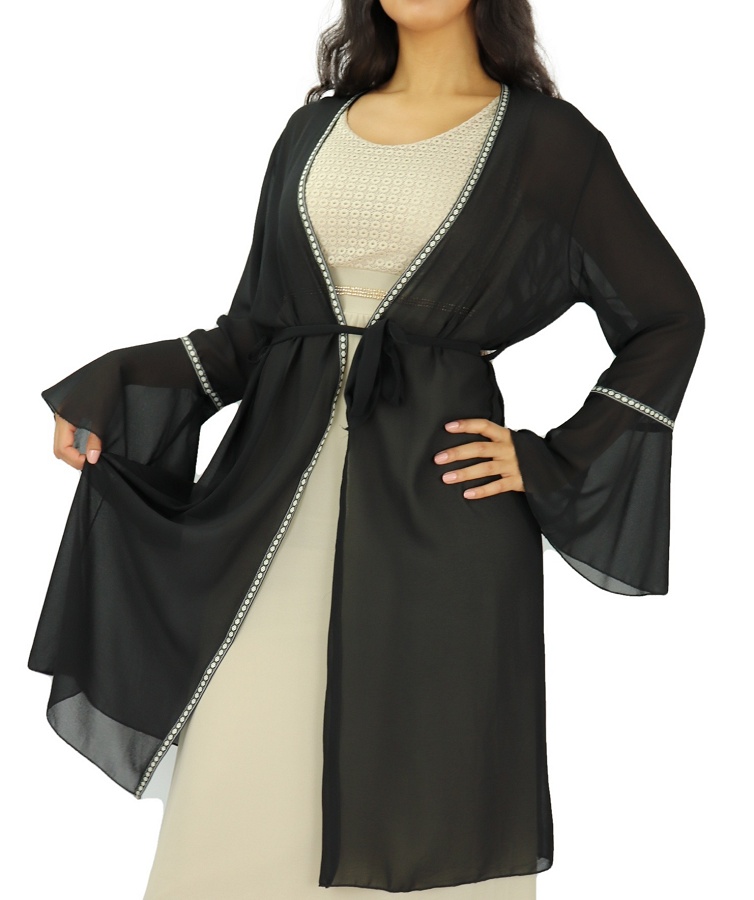 Kimono mi-long, matière fluide ultra léger, avec manches cloches, le tout accompagné d'une ceinture à nouer sous passants à la taille. Une fine broderie sur le long et les manches, Ce kimono est la pièce parfaite pour ajouter une touche bohème à tous vos looks!