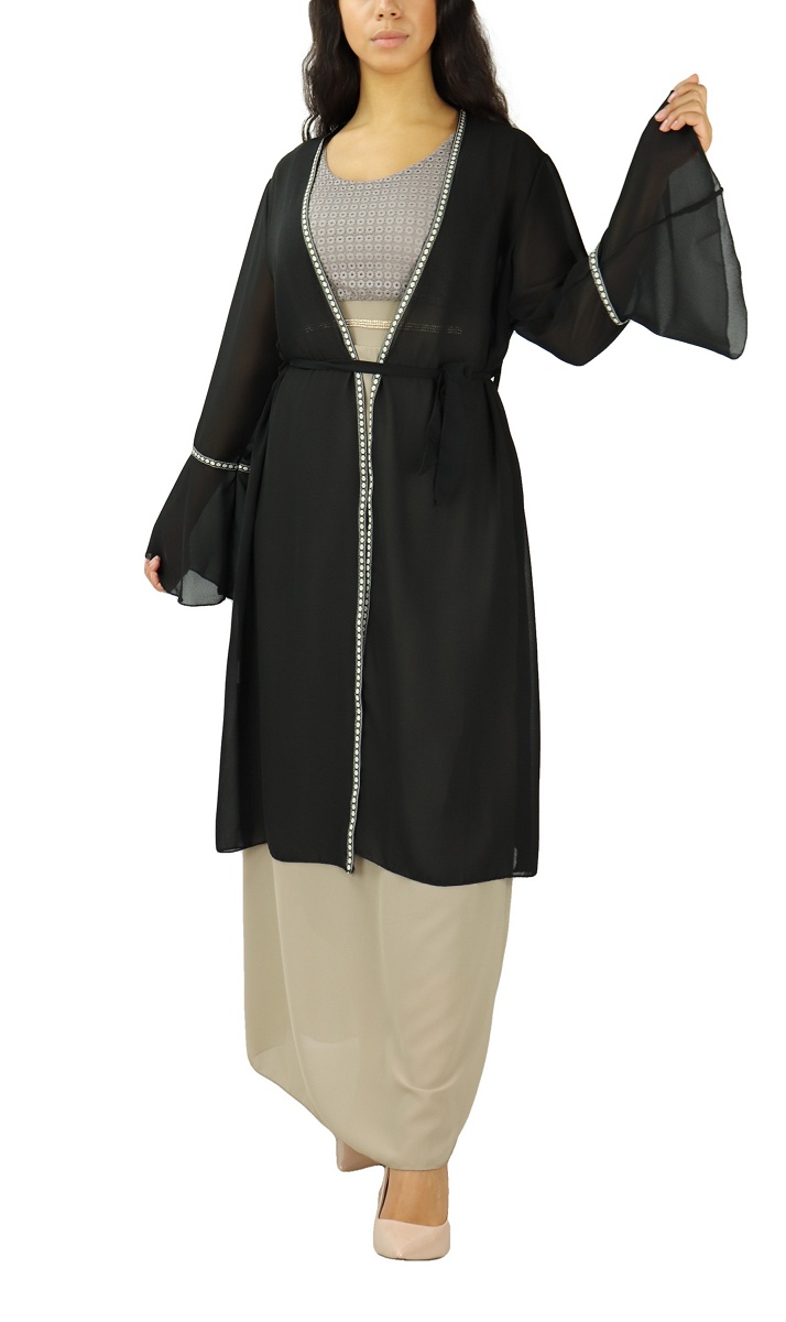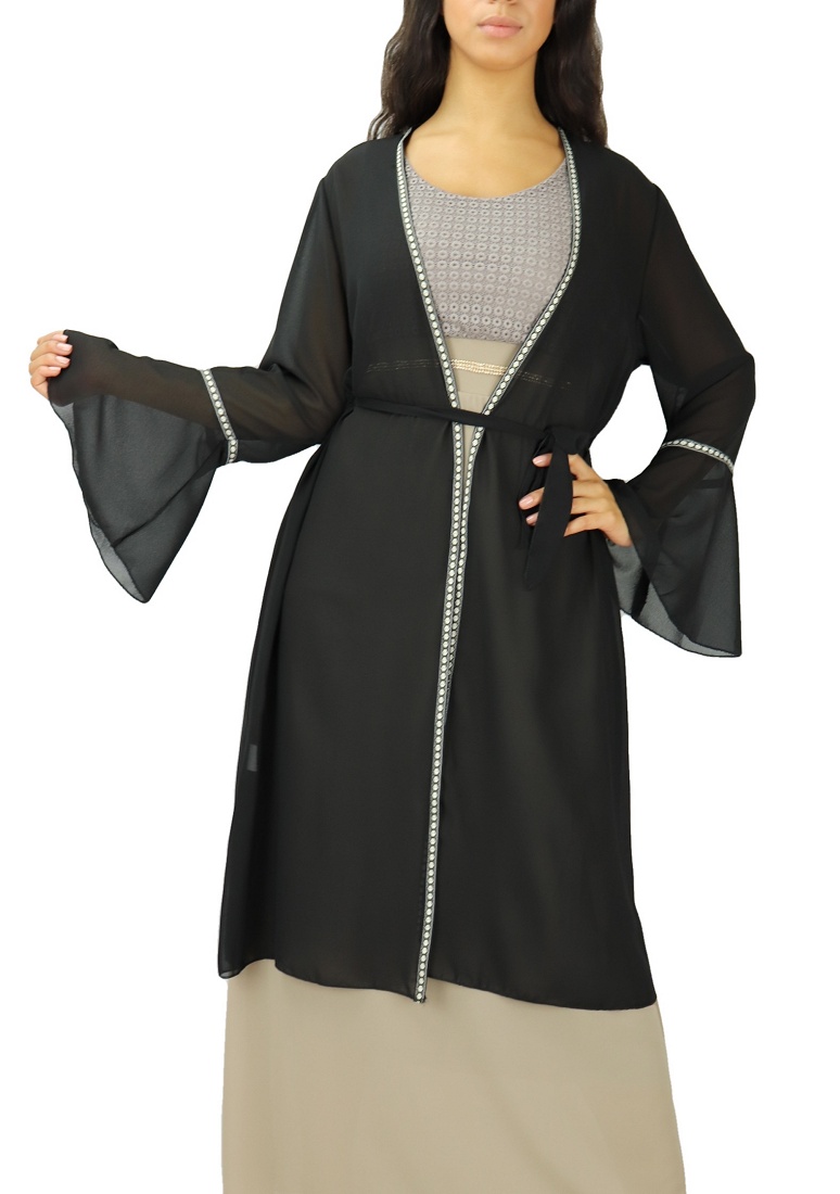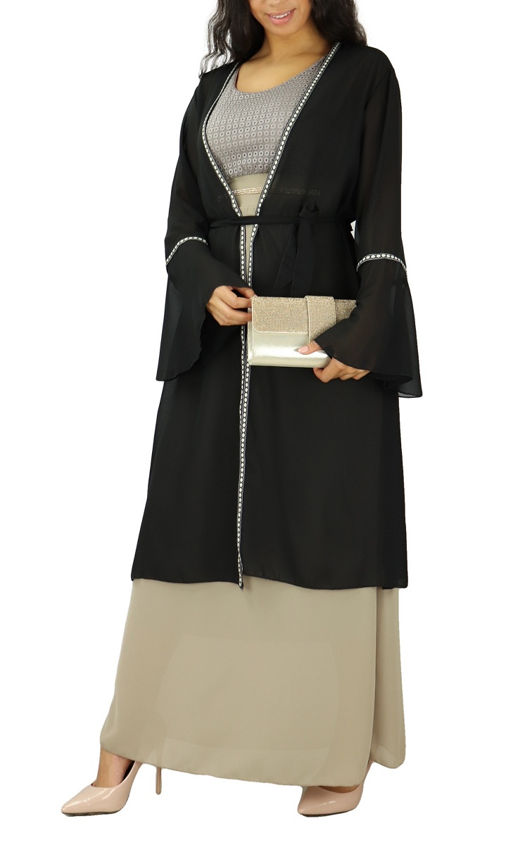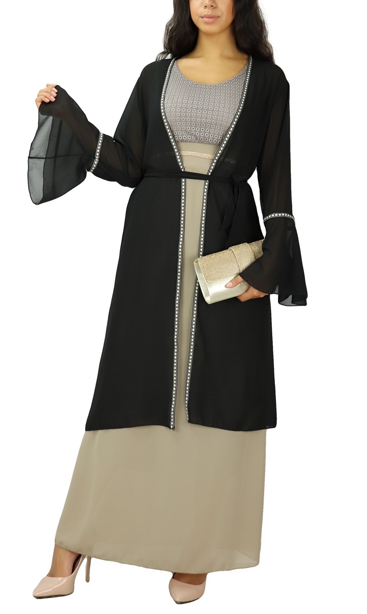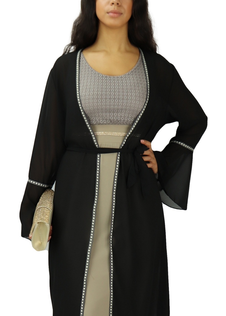 Robe de soirée Abaya Dubaï noire de qualité avec nombreuses broderies, strass et ceinture interne - REF. 38186 (45.00 €)