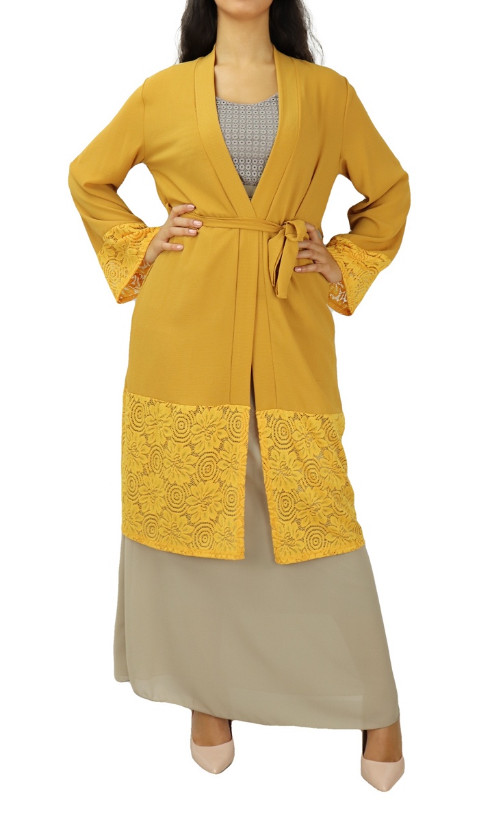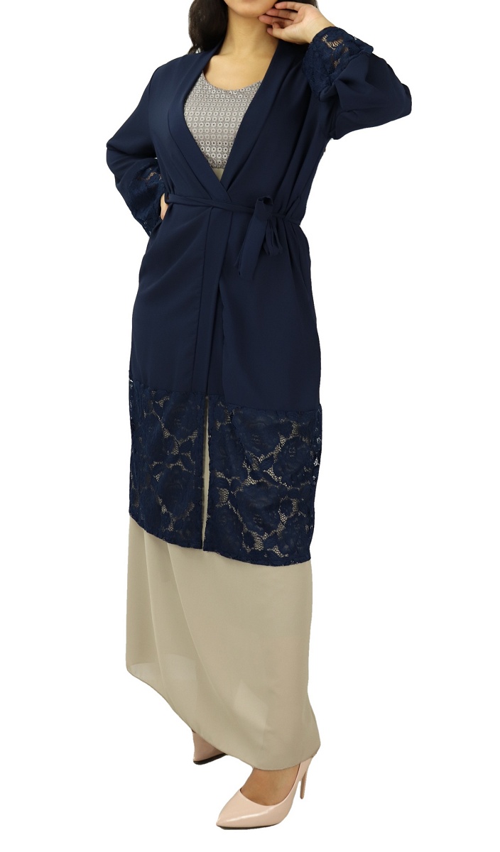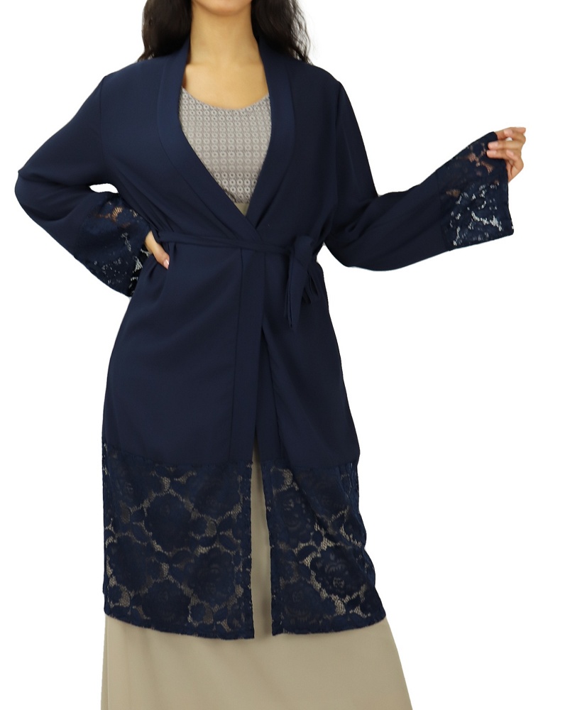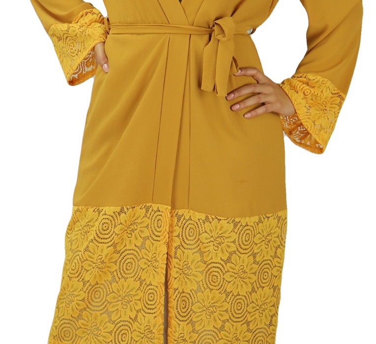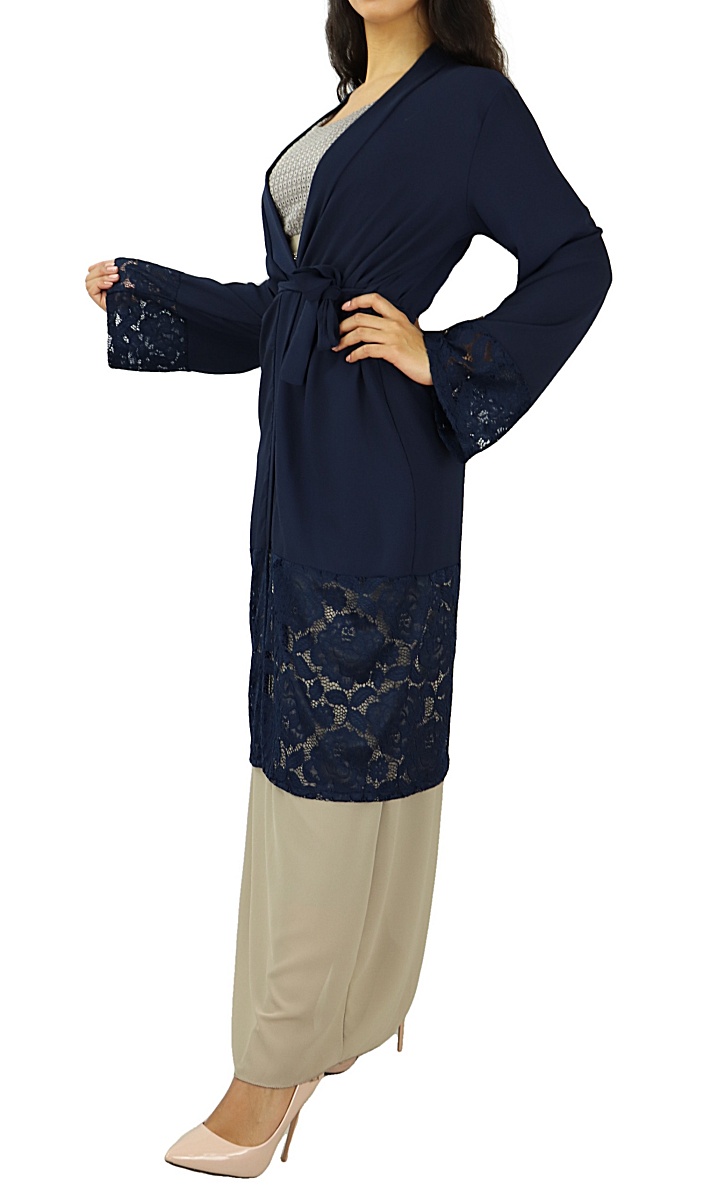 Kimono mi-long, tissu crêpe, très féminin avec ses incrustations de dentelle en bas des manches et du Kimono, le tout accompagné d'une ceinture à nouer sous passants à la taille. Il s'associera facilement avec vos tenues.