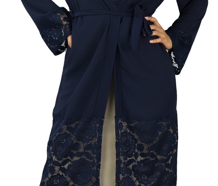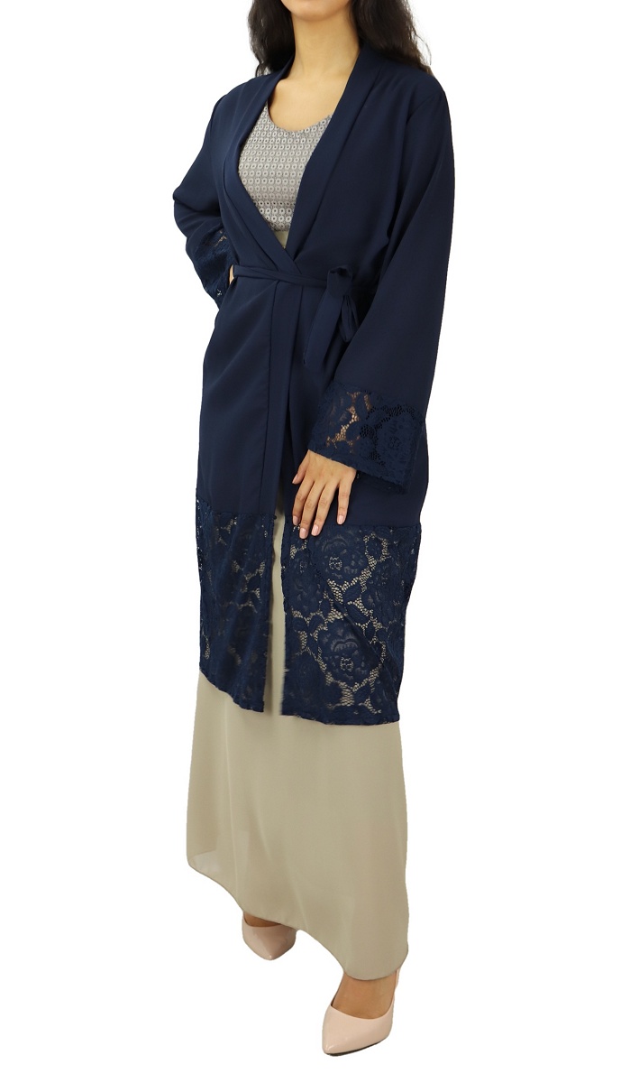 Kimono mi-long, tissu crêpe, très féminin avec ses incrustations de dentelle en bas des manches et du Kimono, le tout accompagné d'une ceinture à nouer sous passants à la taille. Il s'associera facilement avec vos tenues.