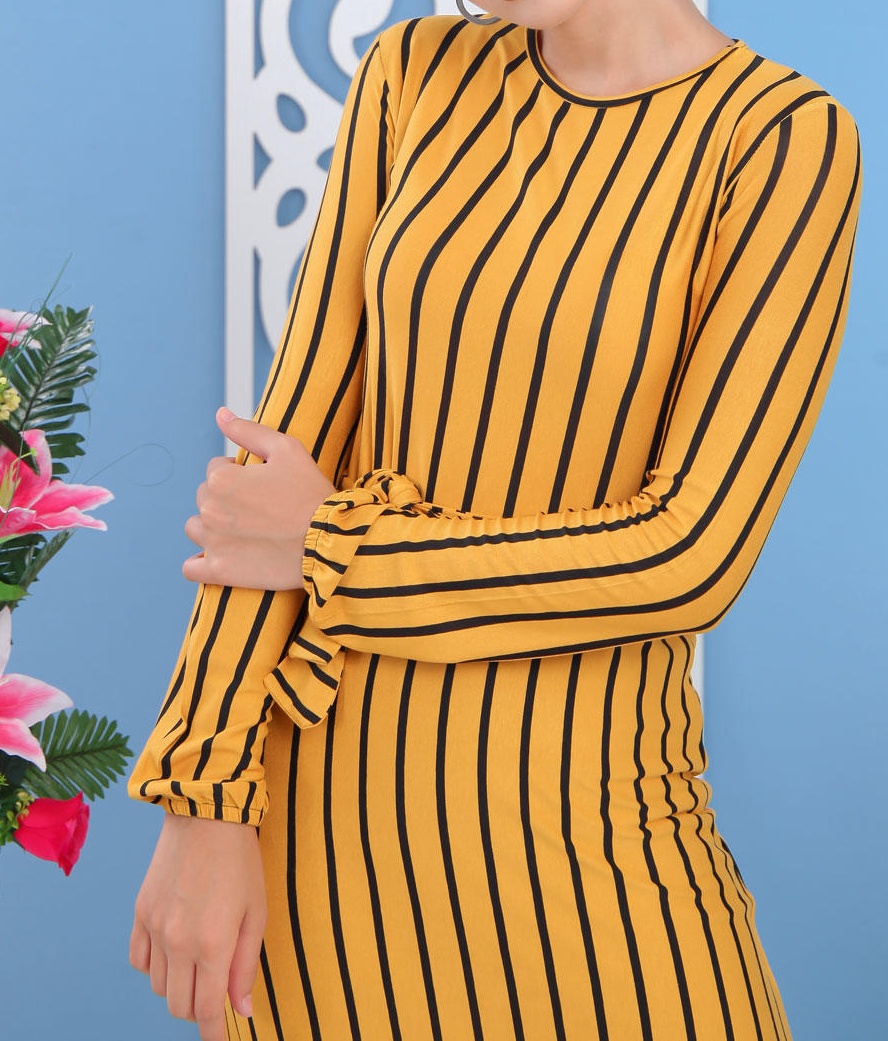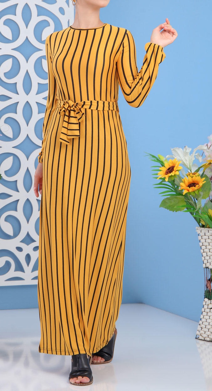 Robe à rayures, col rond, manches longues finition élastiques aux poignets le tout assorti d'une ceinture. Ce modèle sobre et élégant peut se mettre dans multiples occasions.