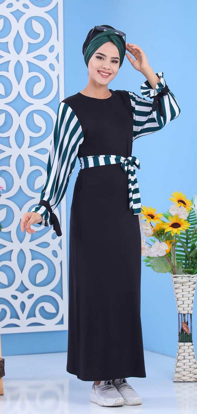Robe pas chere de couleur noire avec manches a rayures noires et blanches pour femme