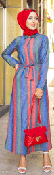 Robe entièrement boutonnée devant avec ceinture assortie (Vetement été femme voilée) - Couleur des rayures : Bleu-Rouge-Gris-Kaki - REF. 32875 (25.00 €)