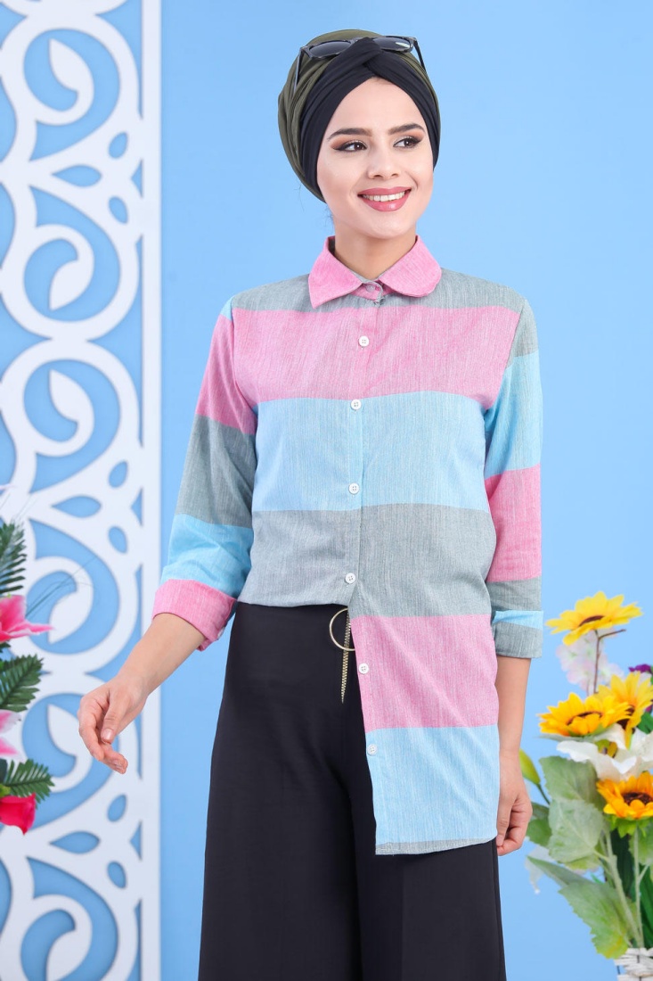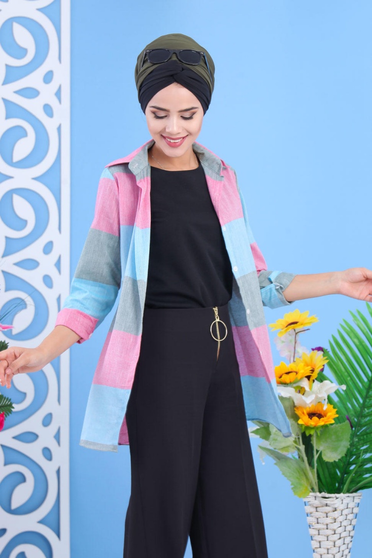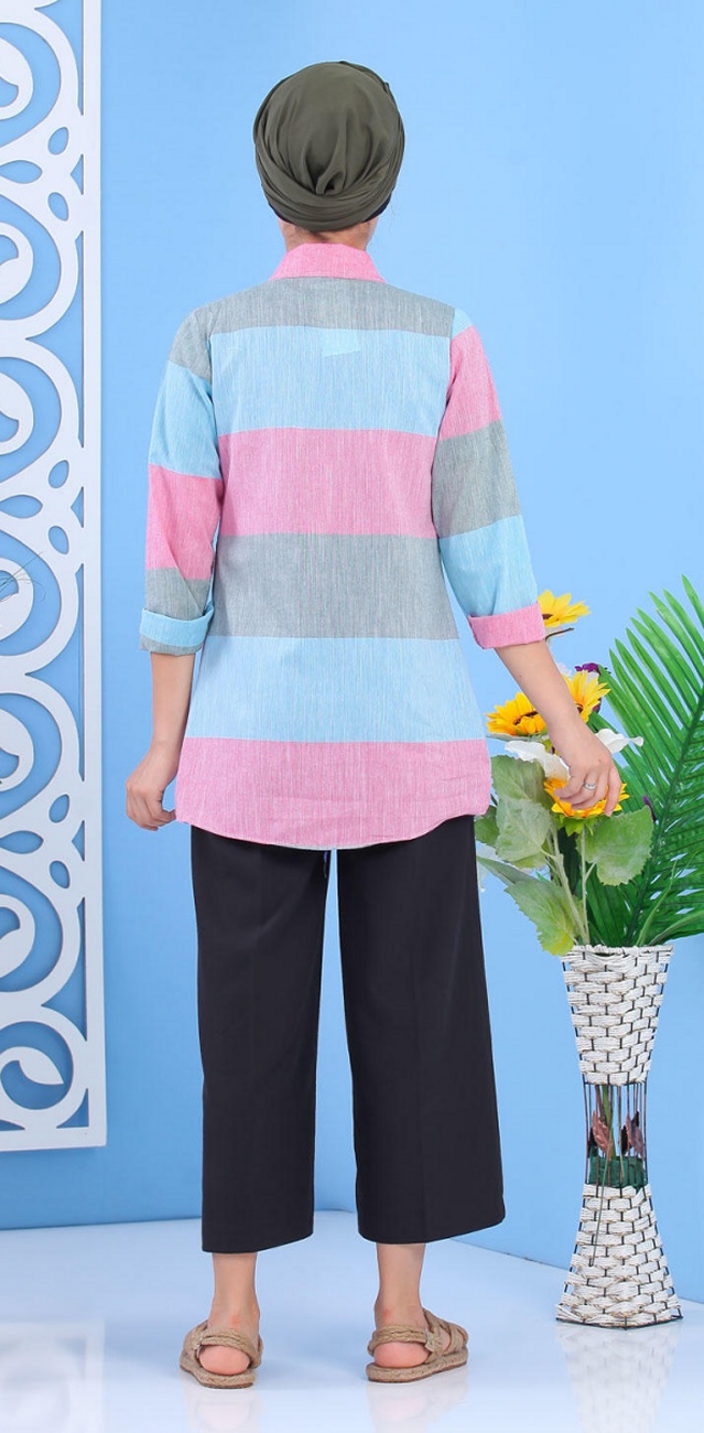Chemise tricolore rose, bleu et vert, ultra légère et facile à porter, manches longues avec fermeture boutons. Vous pouvez la porter avec tout type de pantalon.