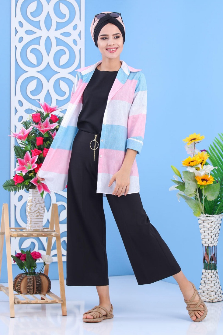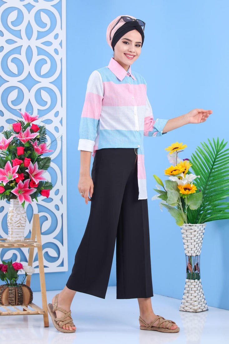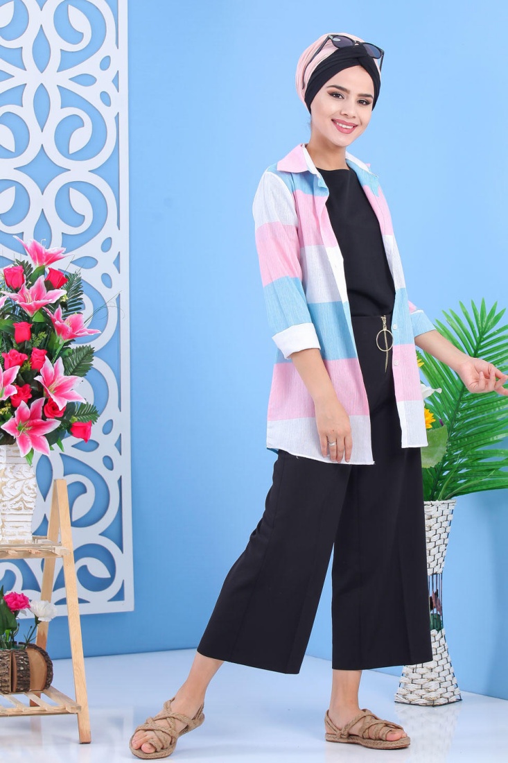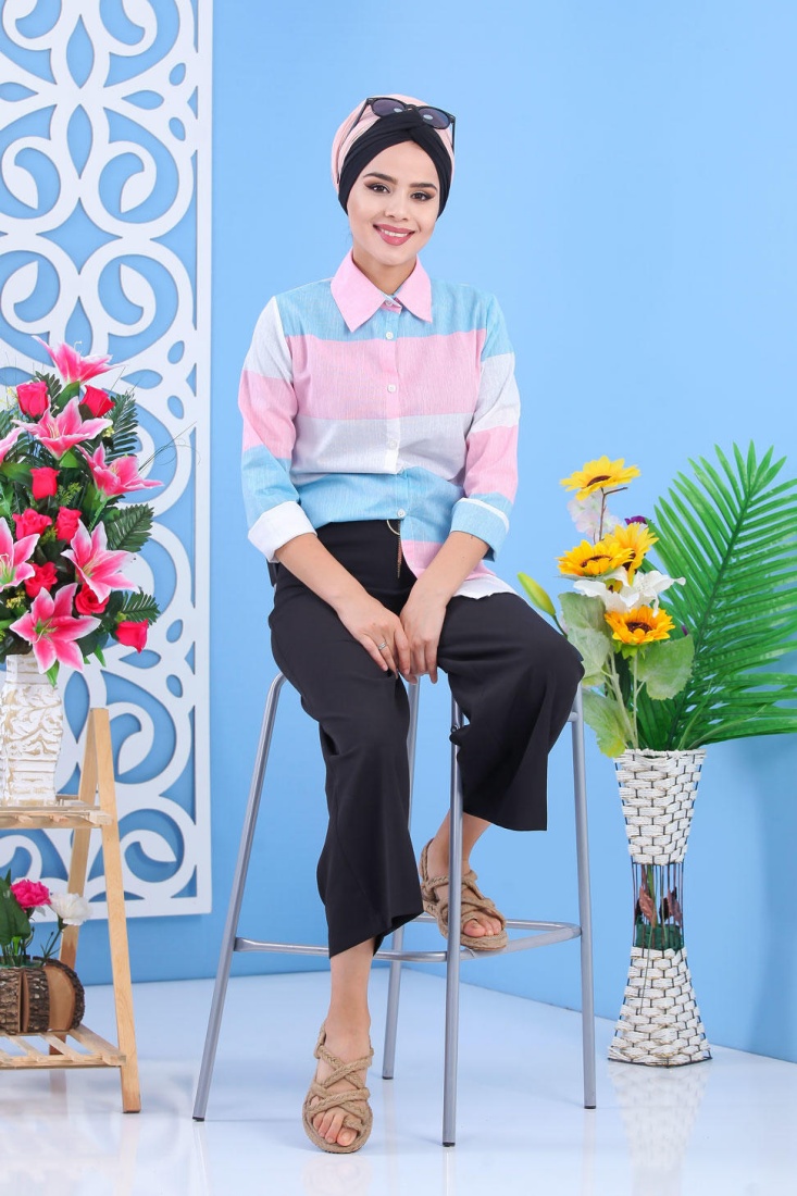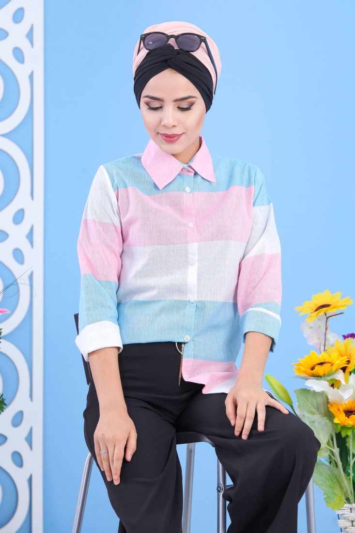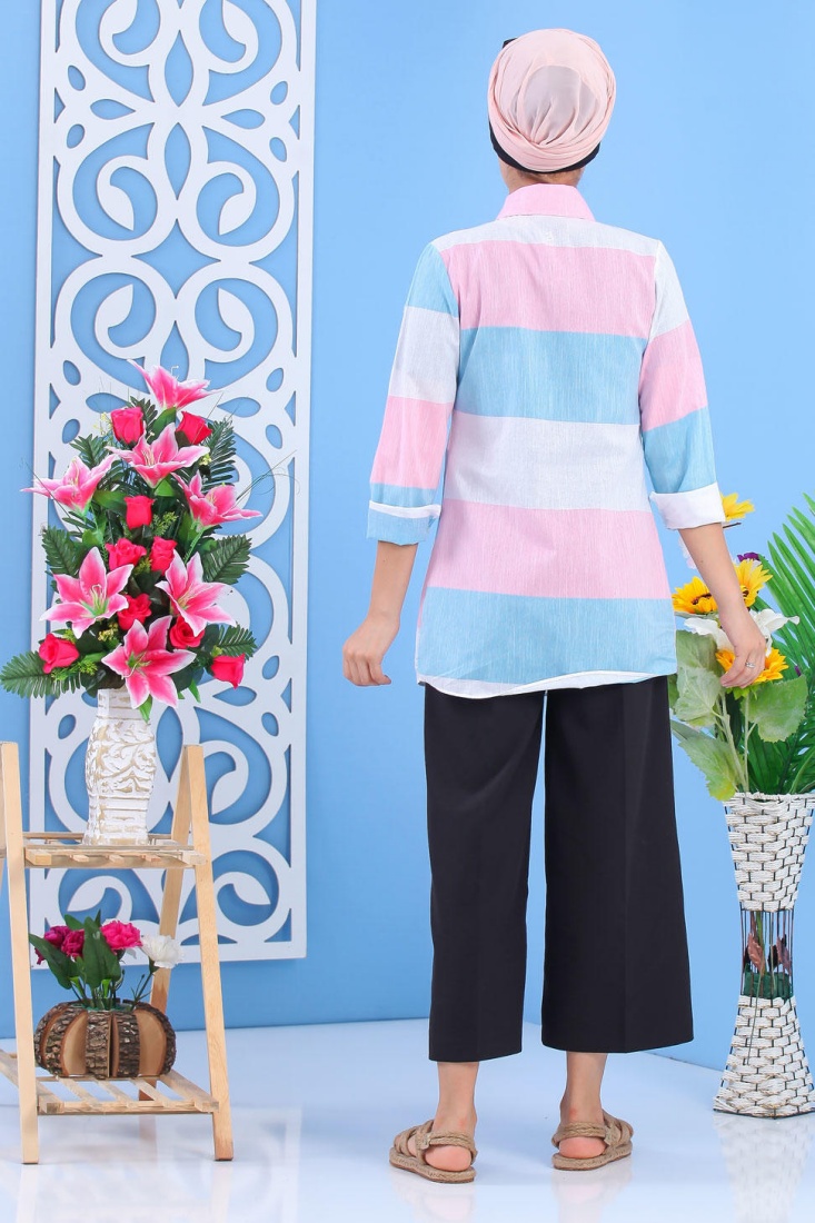 Chemise tricolore rose, bleu et blanc, ultra légère et facile à porter, manches longues avec fermeture boutons. Vous pouvez la porter avec tout type de pontalon.