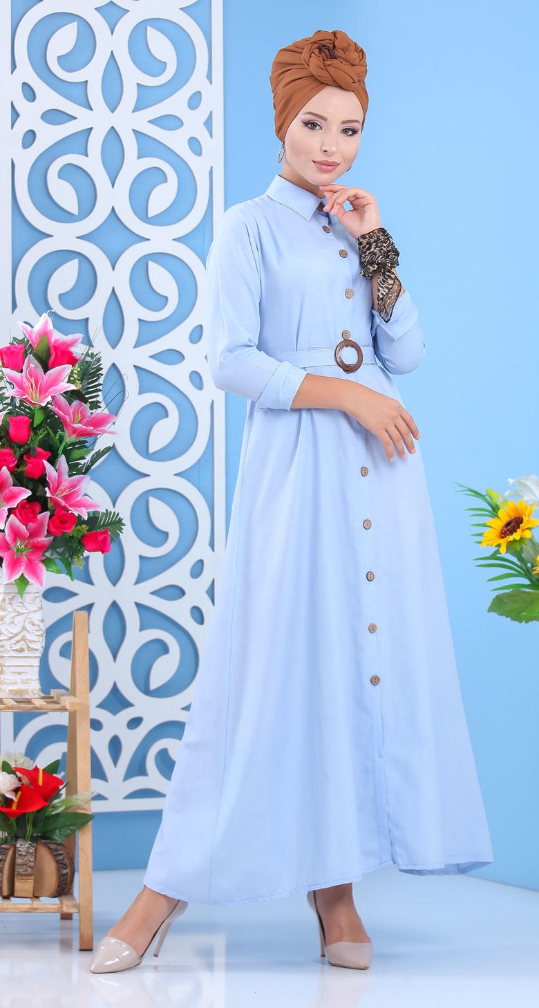 Robe longue boutonne avec ceinture pour femme - Couleur Bleu ciel (Vetement femme moderne et chic pour la ville)