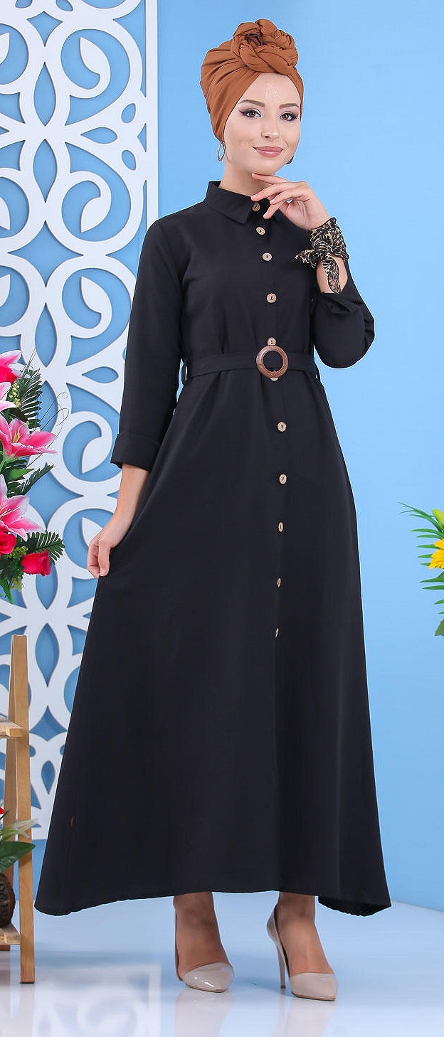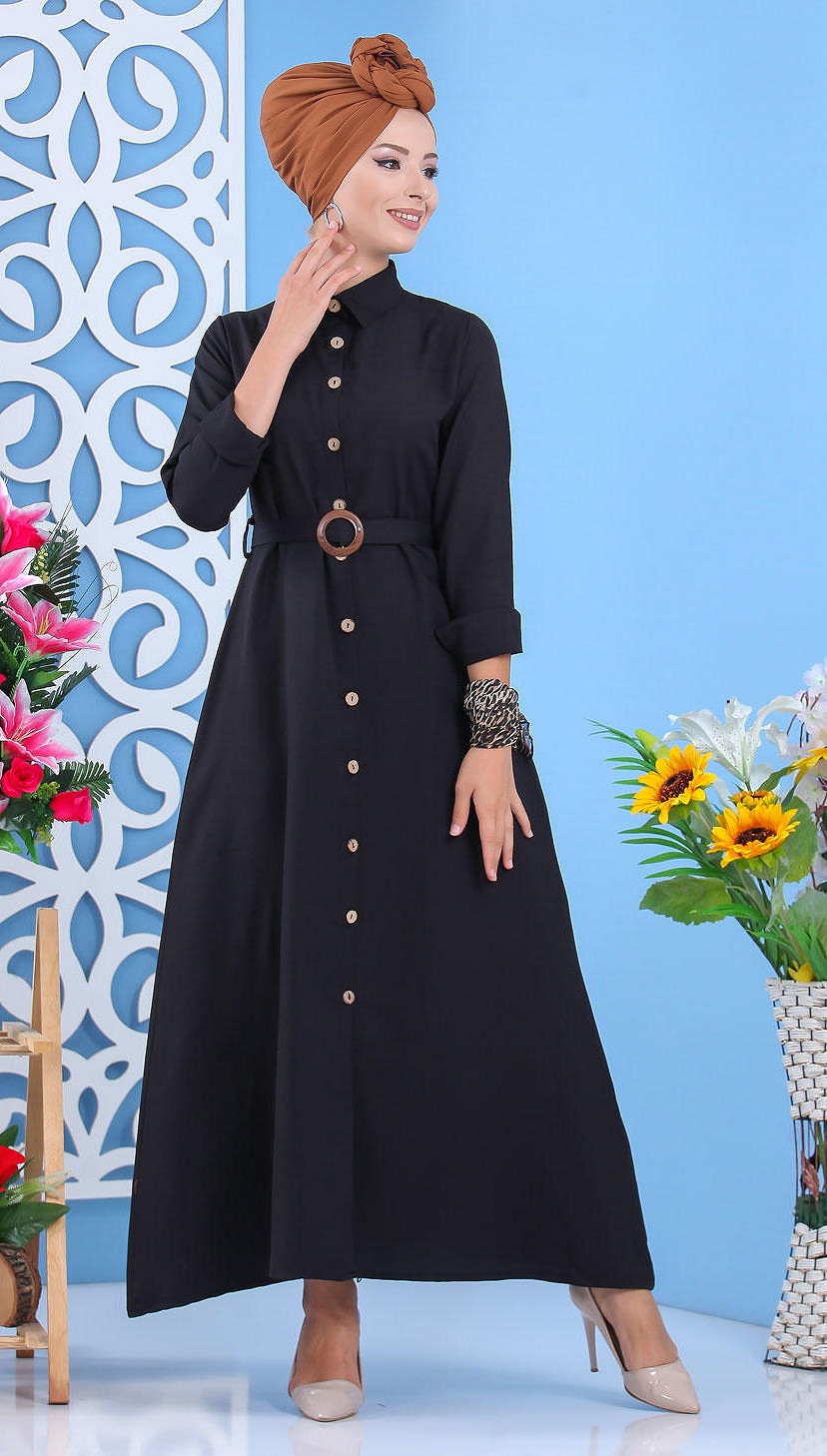 Robe longue boutonné avec ceinture - Couleur Noir (Vetement mastour pour femme) Vetement & Accessoire