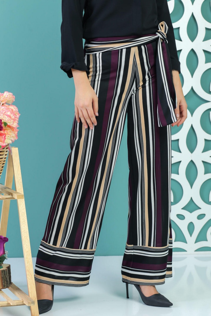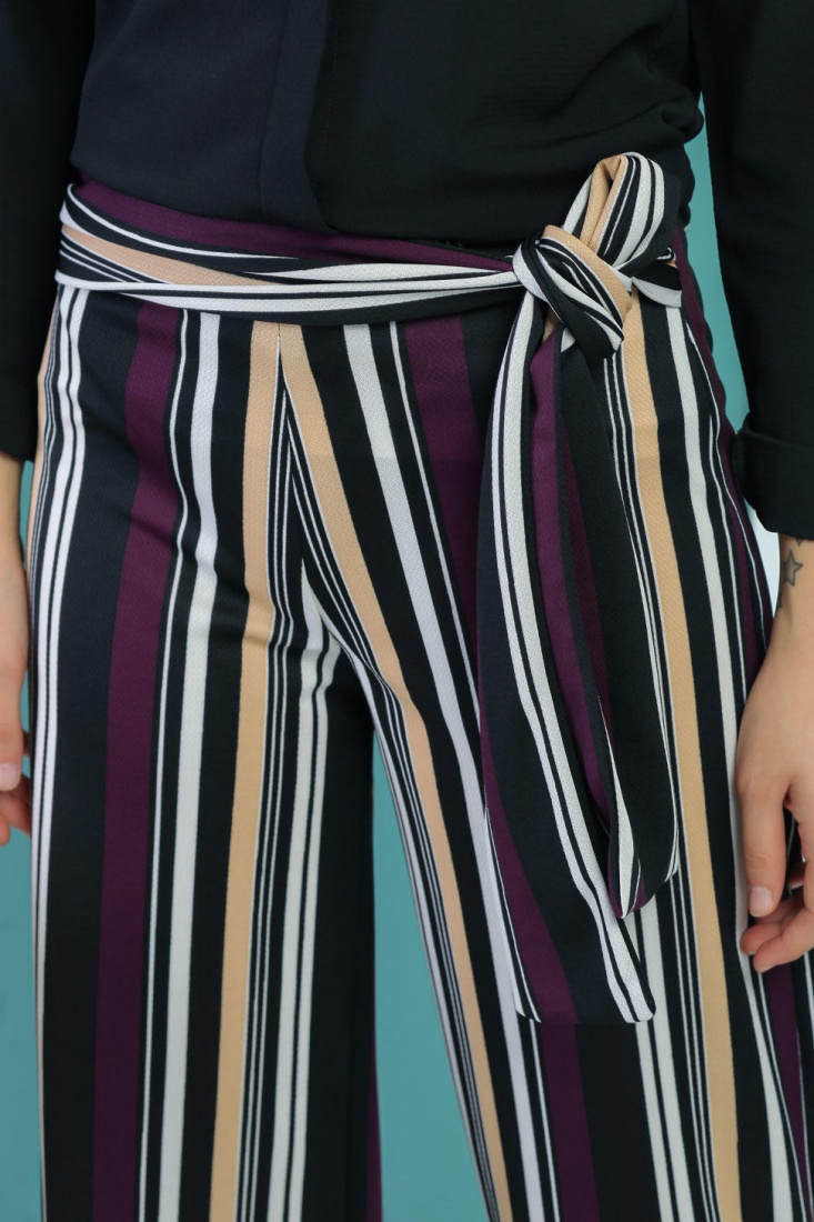 Pantalon femme a rayures noires, beiges et violettes - Marque Amelis Paris