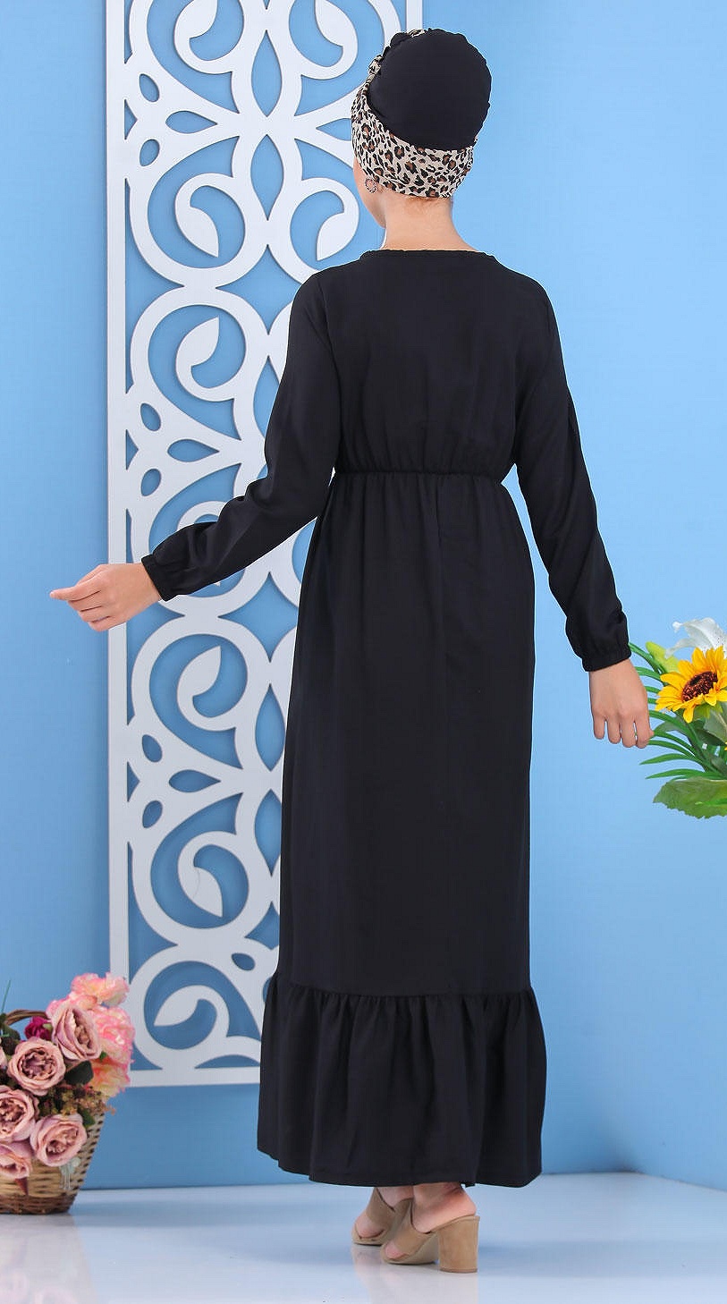 Robe longue, col arrondi, manches finition élastiques aux poignets, taille cintrée par un élastique, effet volant sur la partie basse. Sobre et élégant, ce modèle est adapté pour être porté quotidiennement, il sera encore plus mis en valeur avec quelques accessoires.