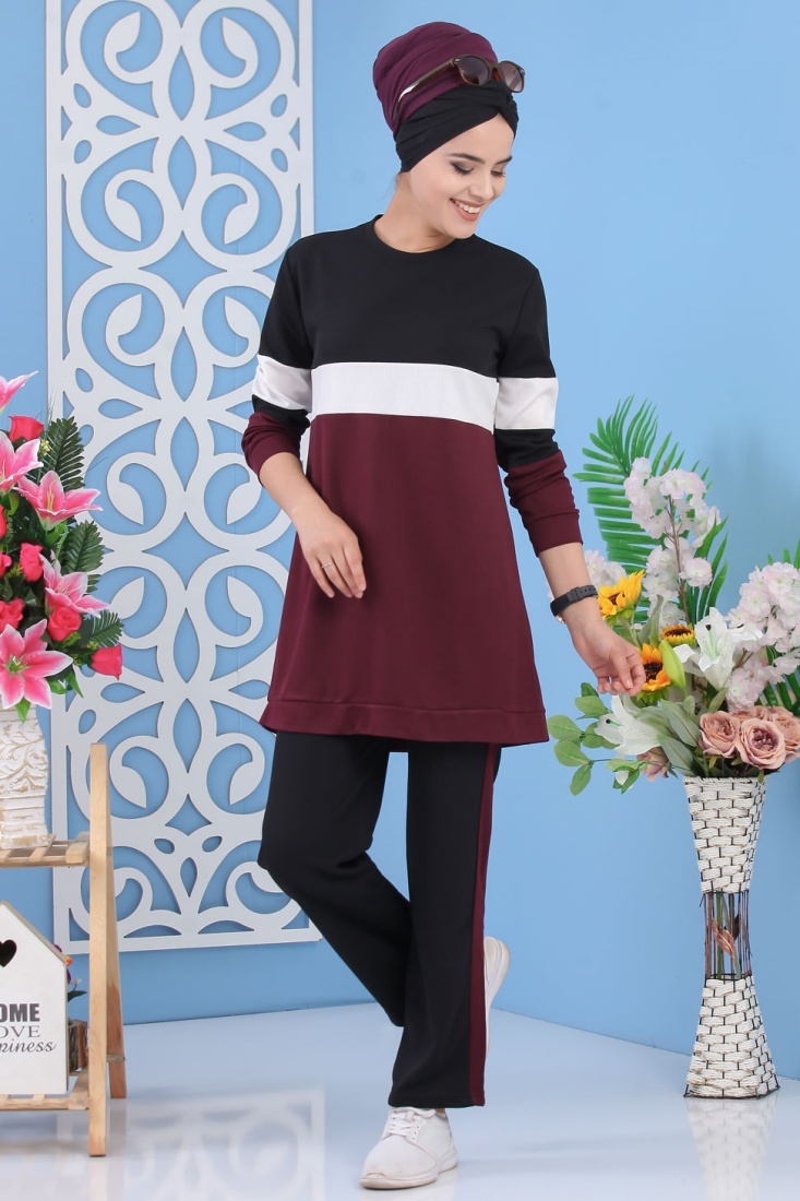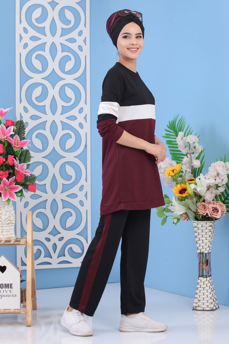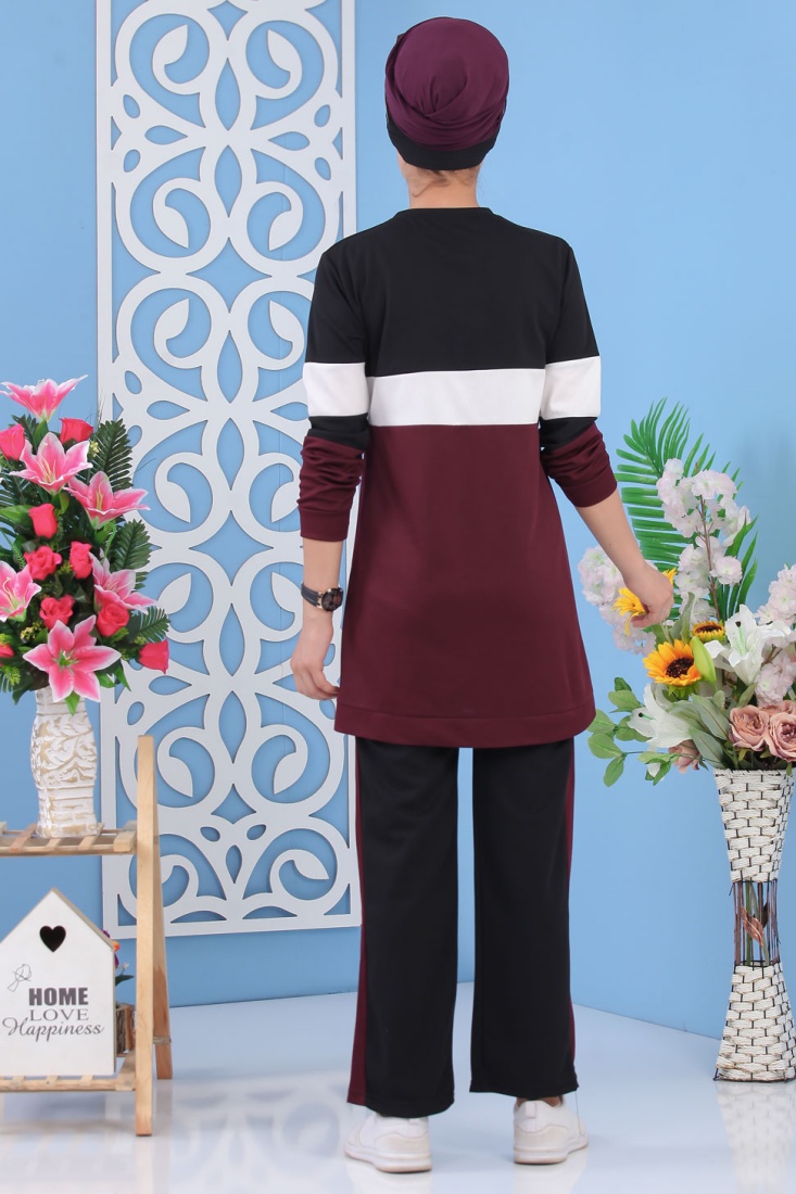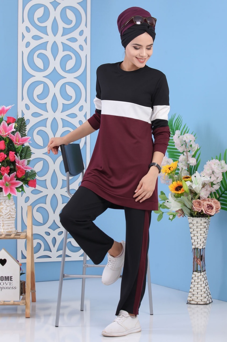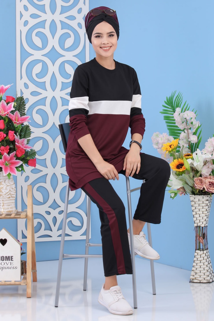Ensemble décontracté de type sportswear pour femme musulmane - Survêtement 2 pièces à rayures - Couleur bordeaux et noir - REF. 33879 (25.00 €)