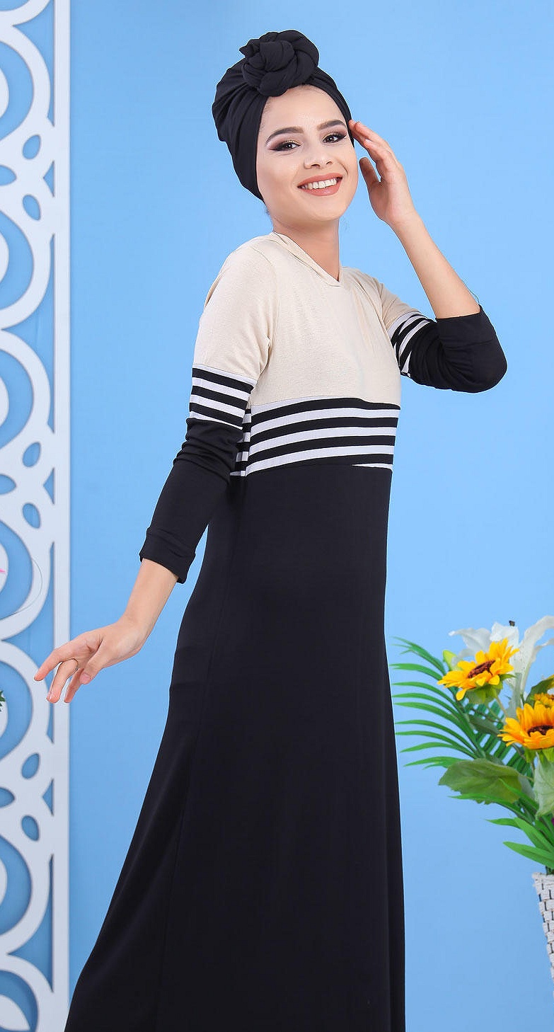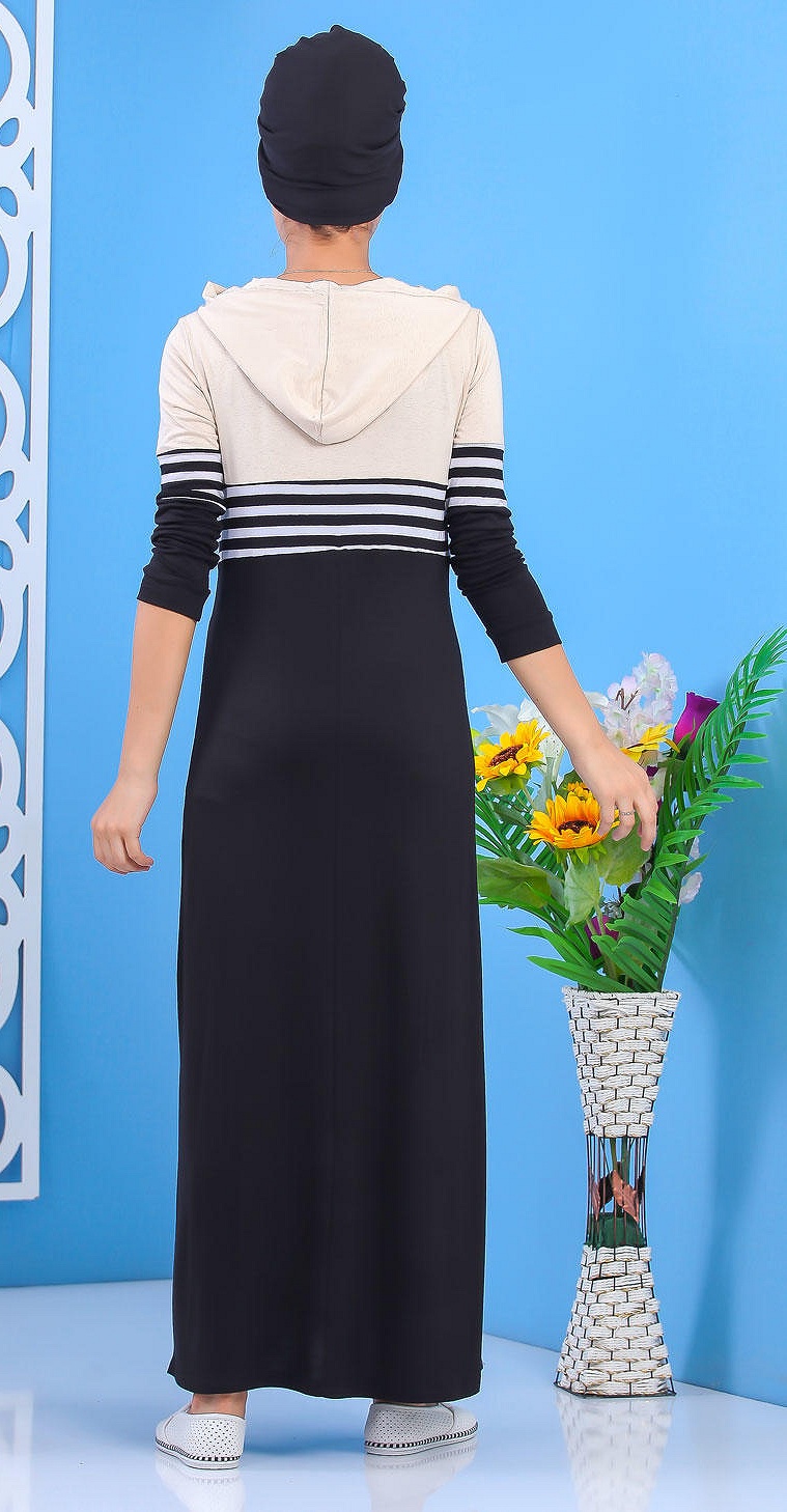 Robe noire manches longues, haut de couleur beige avec col capuche. Ce modèle sobre et élégant peut se mettre dans multiples occasions. Avec sa matière fluide et sa coupe droite, elle est idéale pour avoir un look décontracté.