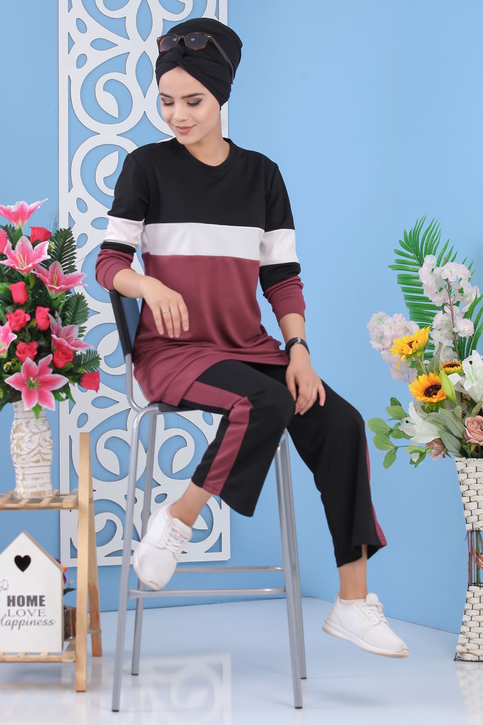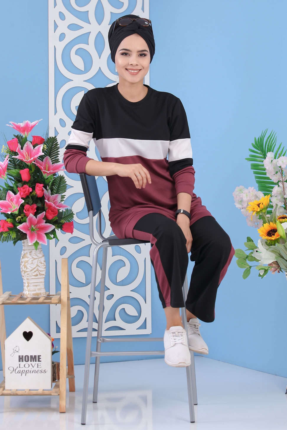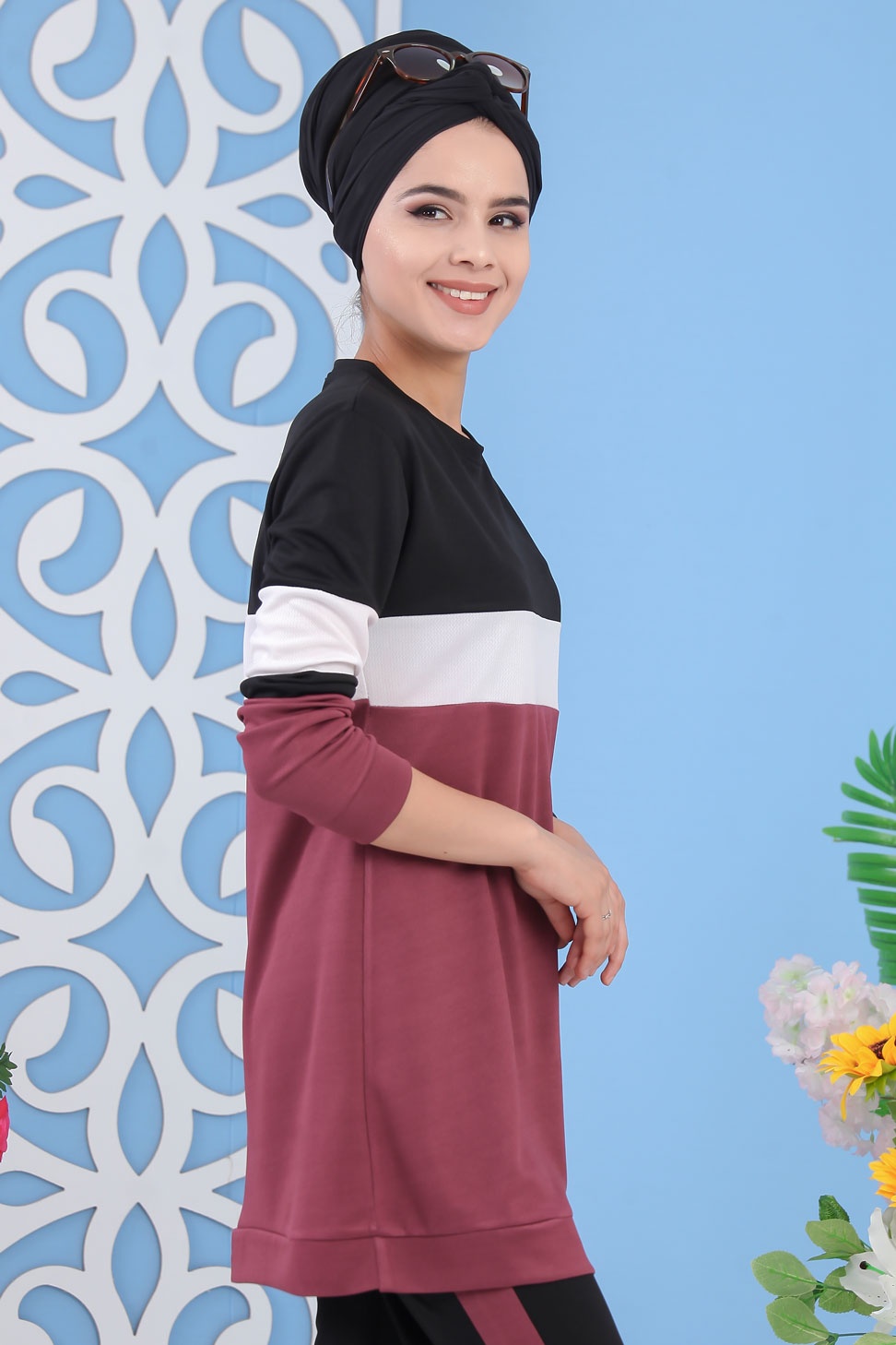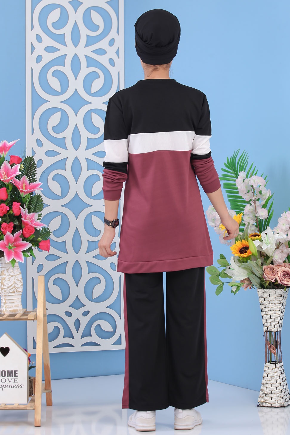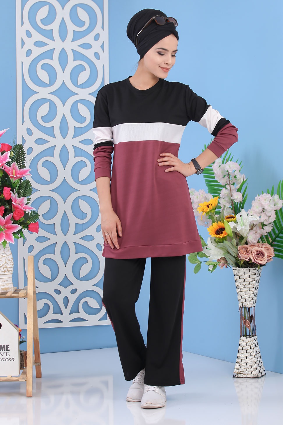 Survêtement tricolore à capuche imprimé "Breathe" (Sportwear femme voilée) - Couleur Bordeaux, noir et blanc - REF. 33126 (29.90 €) - En Promotion à 24.00 €