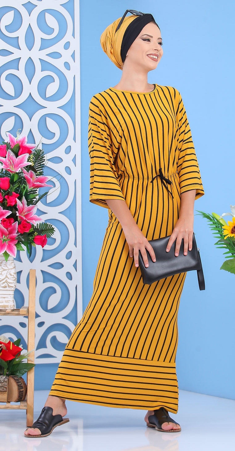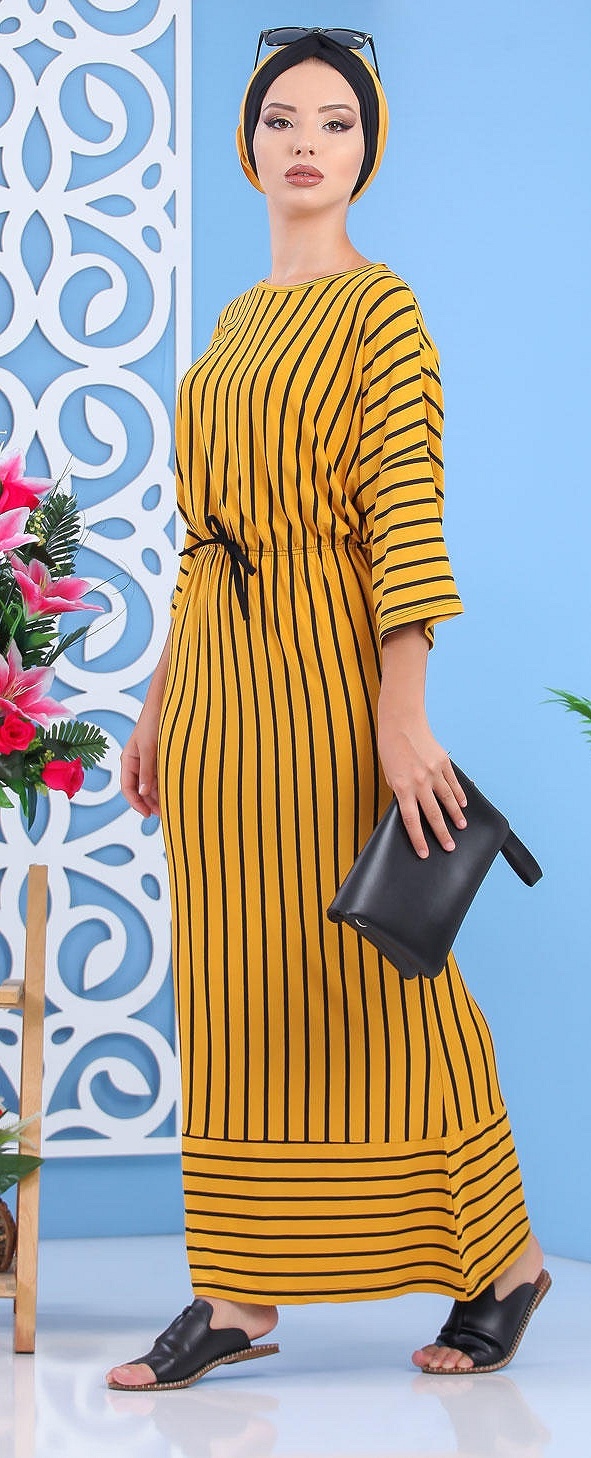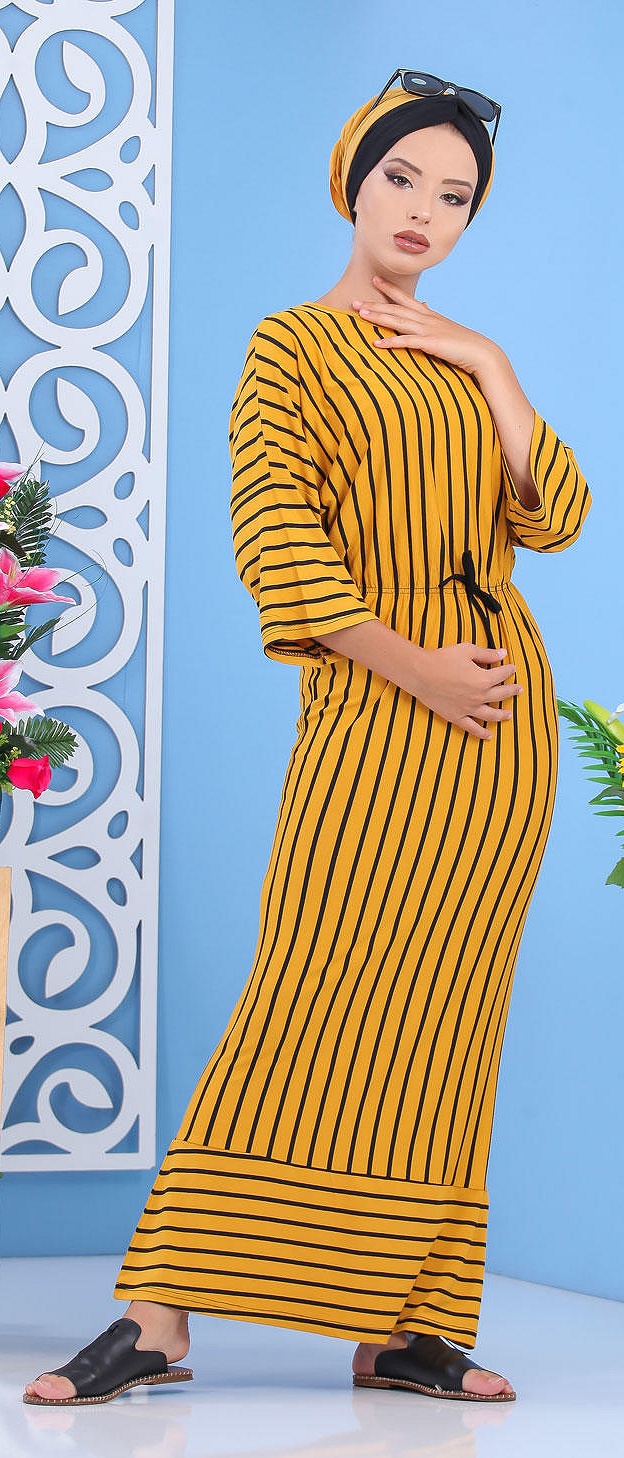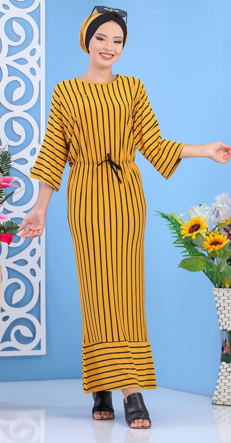 Robe longue a rayures style decontracte pour femme - Couleur jaune moutarde