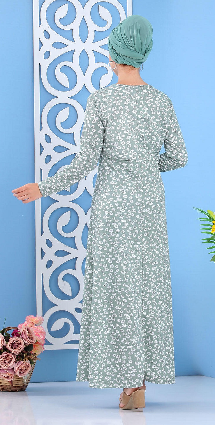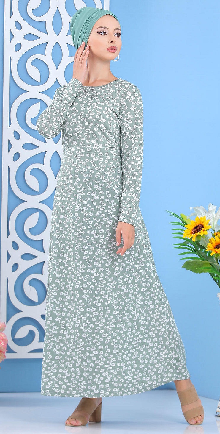 Robe longue, col rond, taille cintrée, coupe évasée, imprimés "nénuphar". Cette robe au tissu fluide conviendra au quotidien aussi en journée qu'en soirée, à vous de trouver les accessoires pour lui ajouter de la valeur.