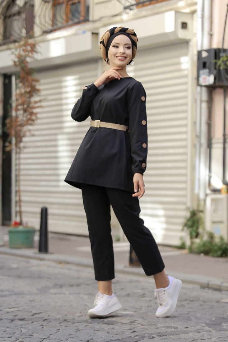 Ensemble Femme : Tunique et Pantalon avec Ceinture couleur Noir (Marque "Amelis Paris" elegance et modernite)