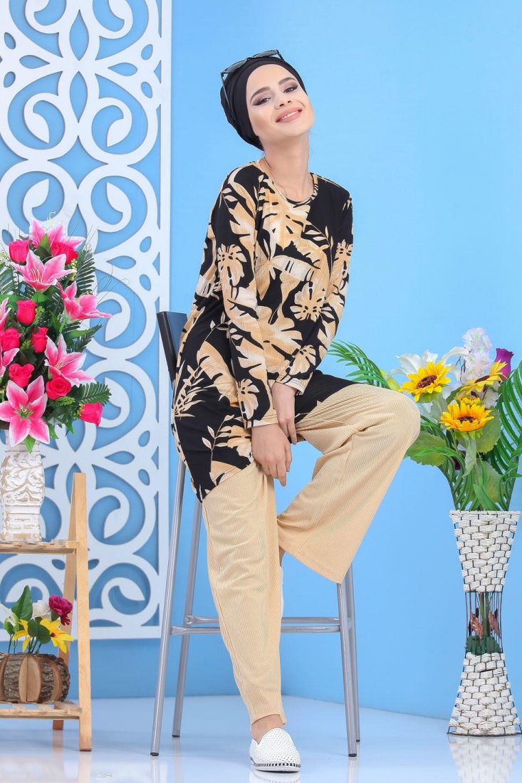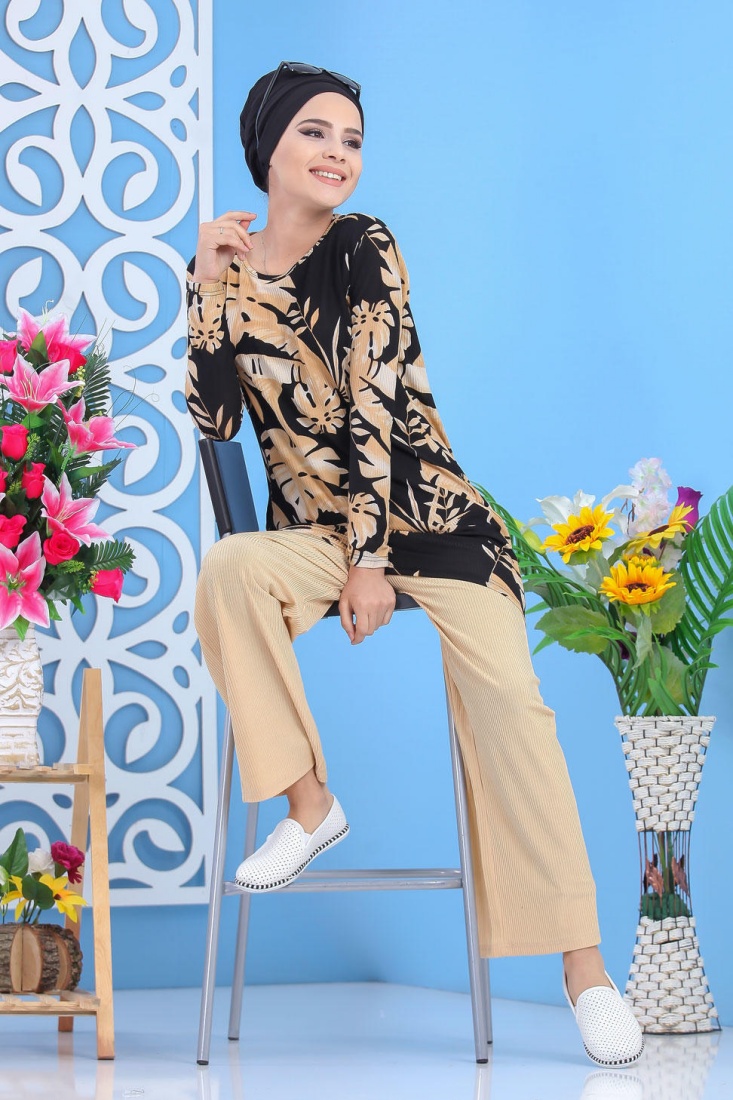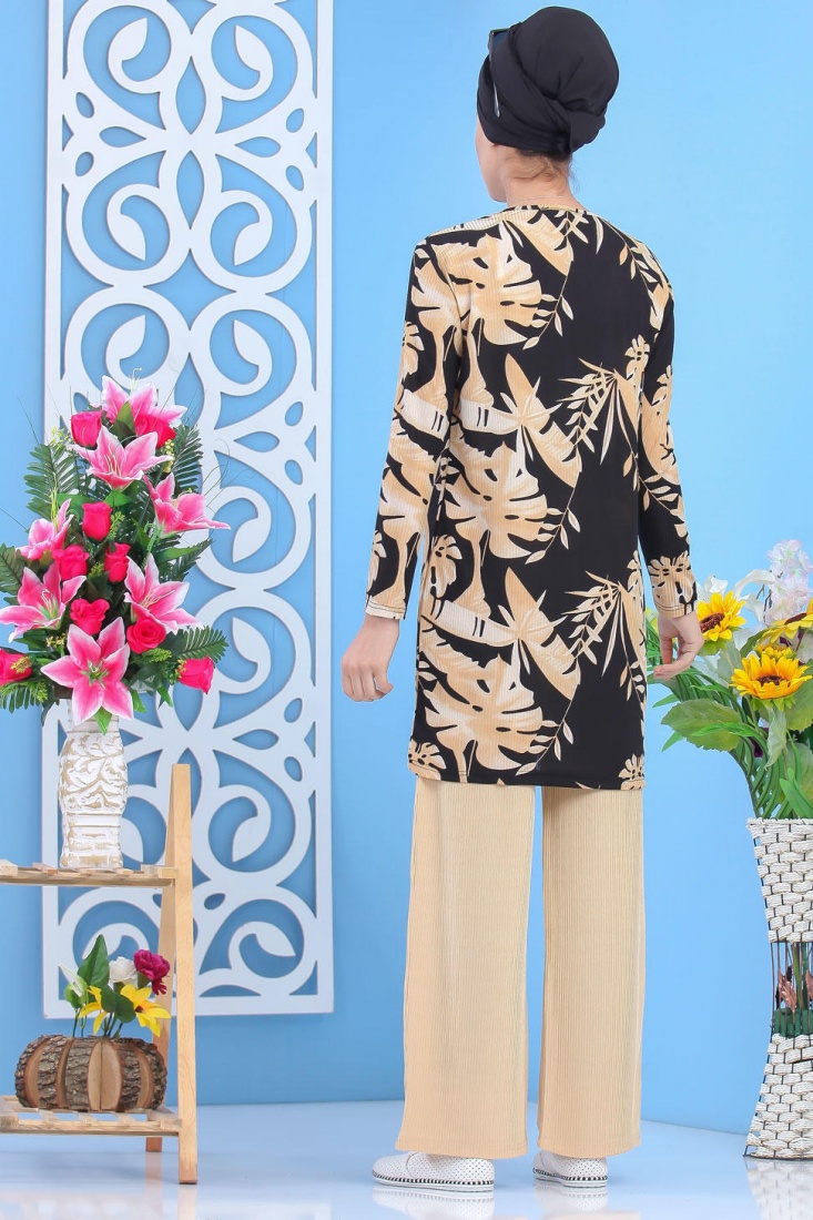 Ensemble Pantalon + Tunique mi longue imprimée avec un style tropical, col rond, manches longues, tissu crêpe fluide. Pantalon large coupe droite, Cet ensemble s’apprête à diverses occasions aussi bien festives que quotidiennes.