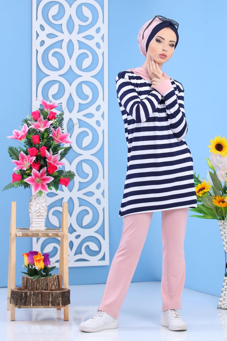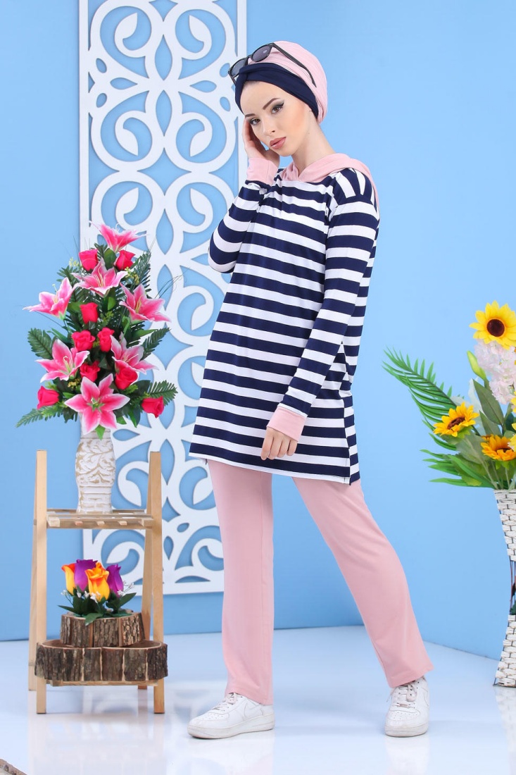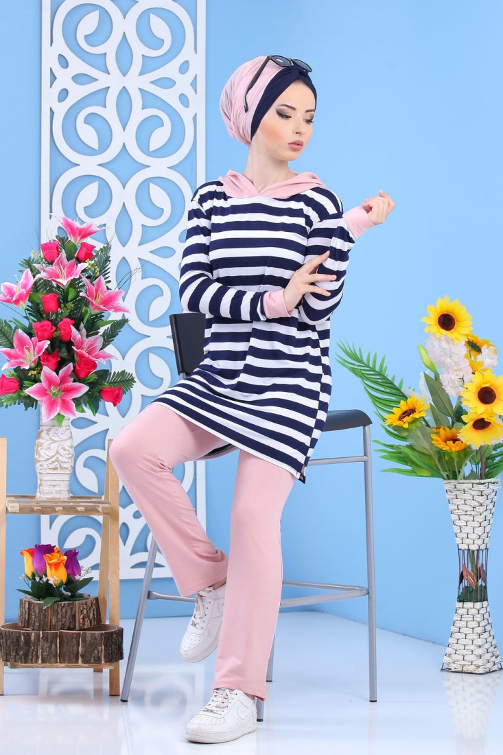 Ensemble 2 pièces, pantalon + Tunique à rayures, manches longues, capuche et pantalon de même couleur, cet ensemble tendance vous permettra de vous sentir bien dans votre peau.