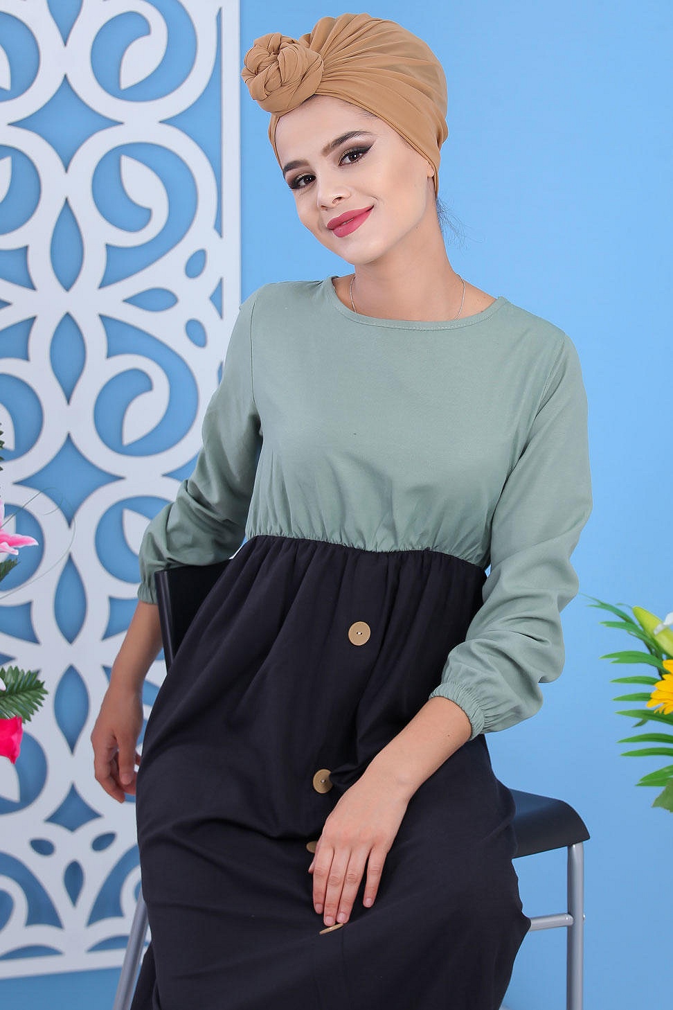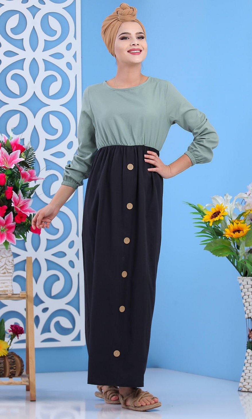 Robe longue bi-couleur à boutons pour femme - Couleur vert amande Vetement & Accessoire