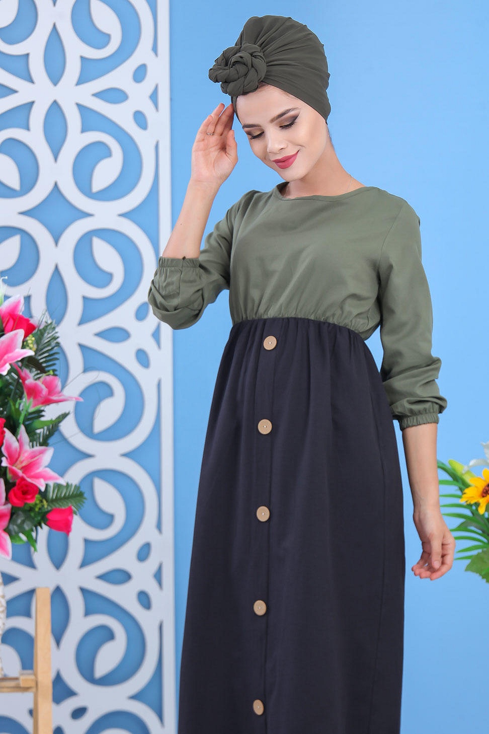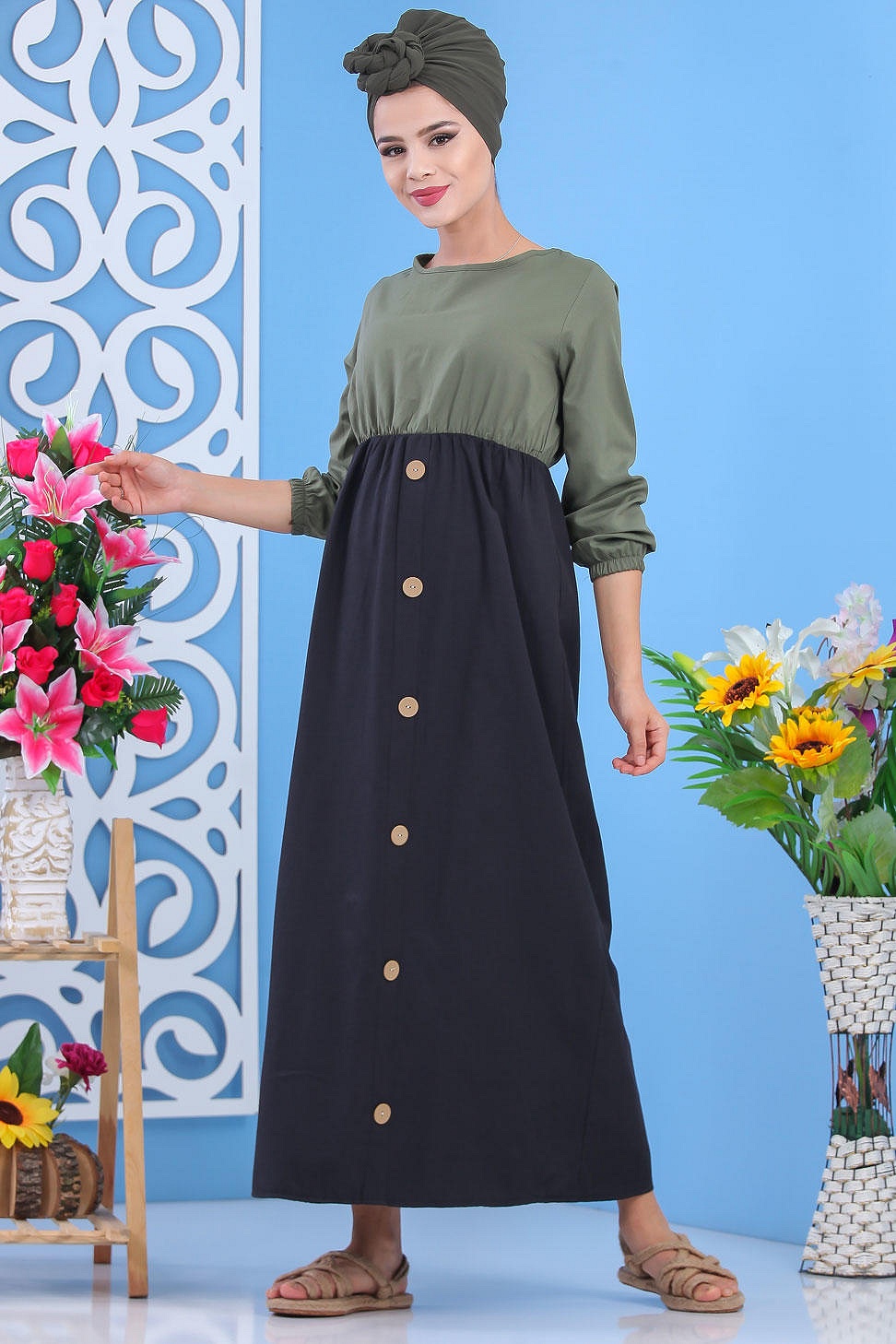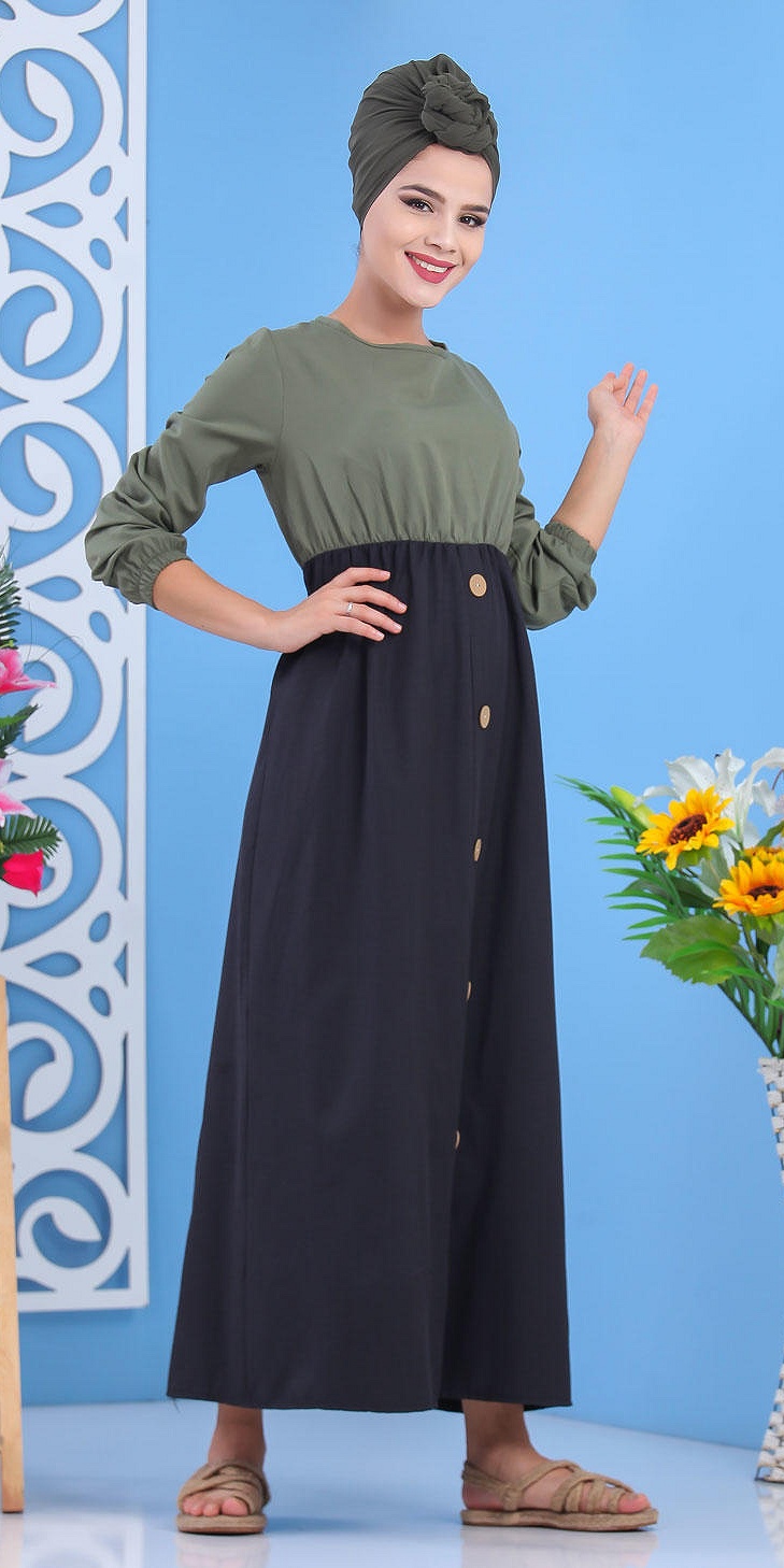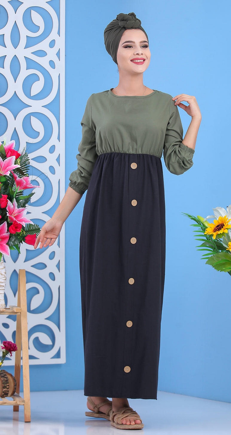 Robe longue fluide entièrement boutonnée devant (Vetement hijab turque casual) - Couleur Kaki - REF. 33950 (35.00 €)