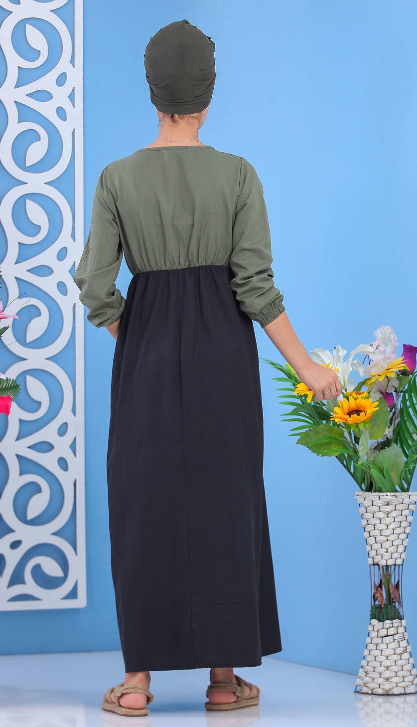 Robe longue bicolore a boutons pour femme - Couleur kaki