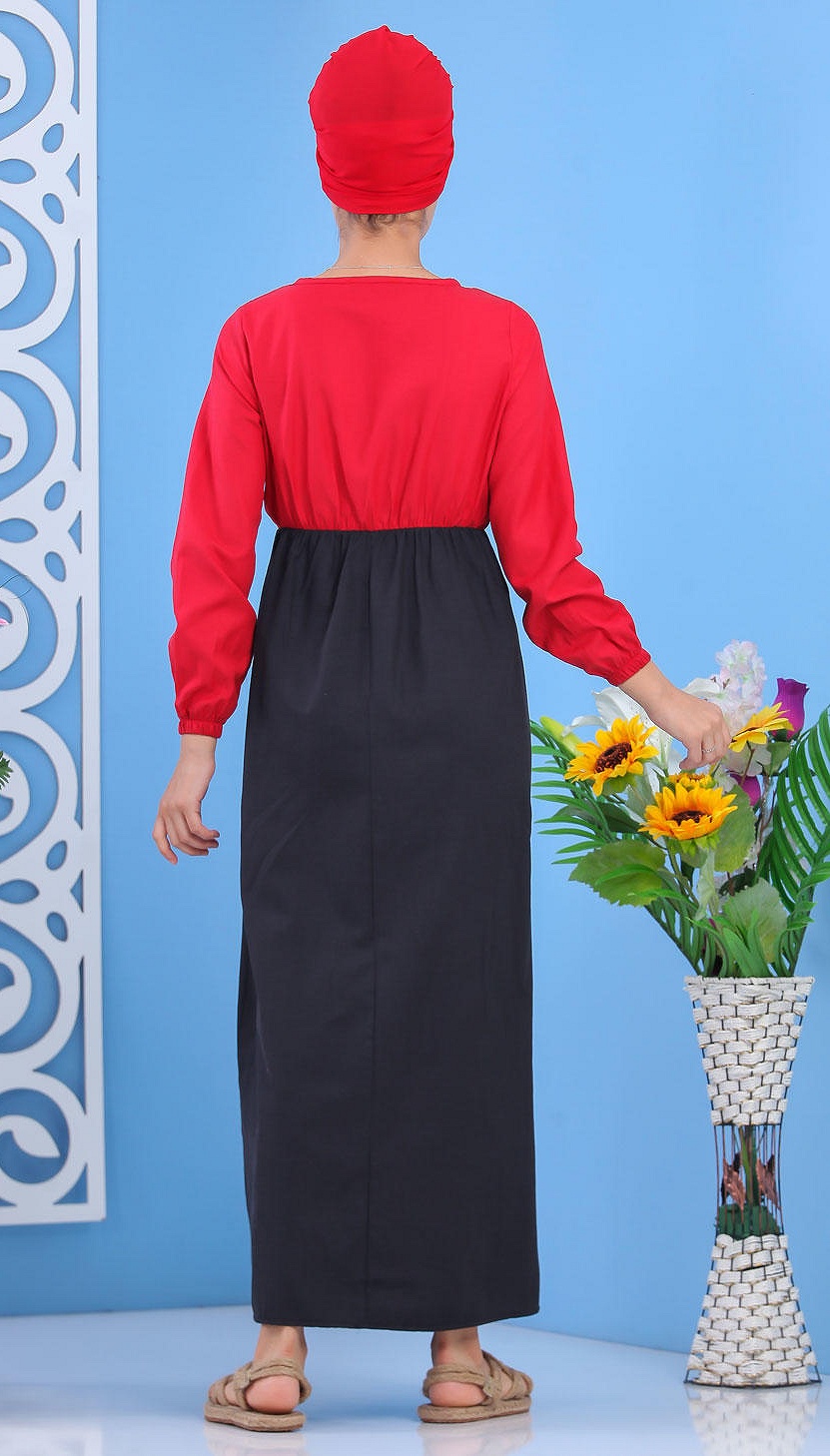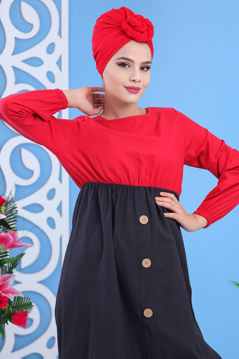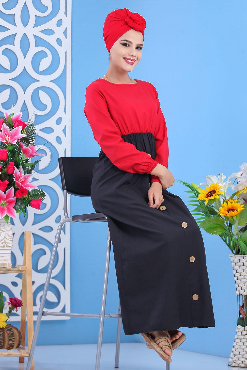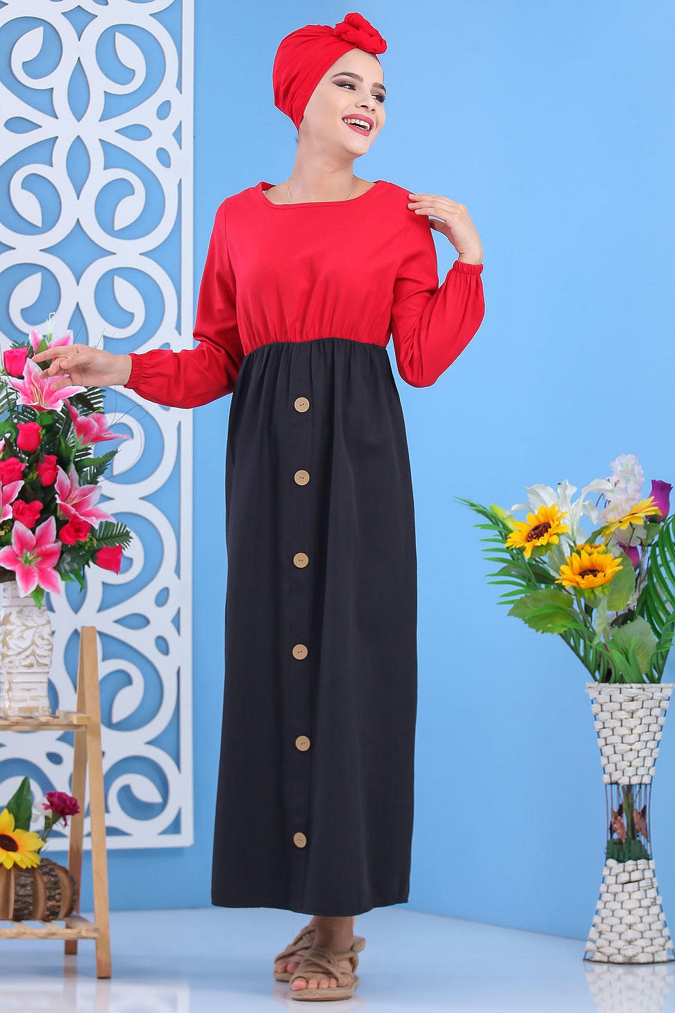 Robe longue bicolore à boutons pour femme - Couleur rouge coquelicot Vetement & Accessoire