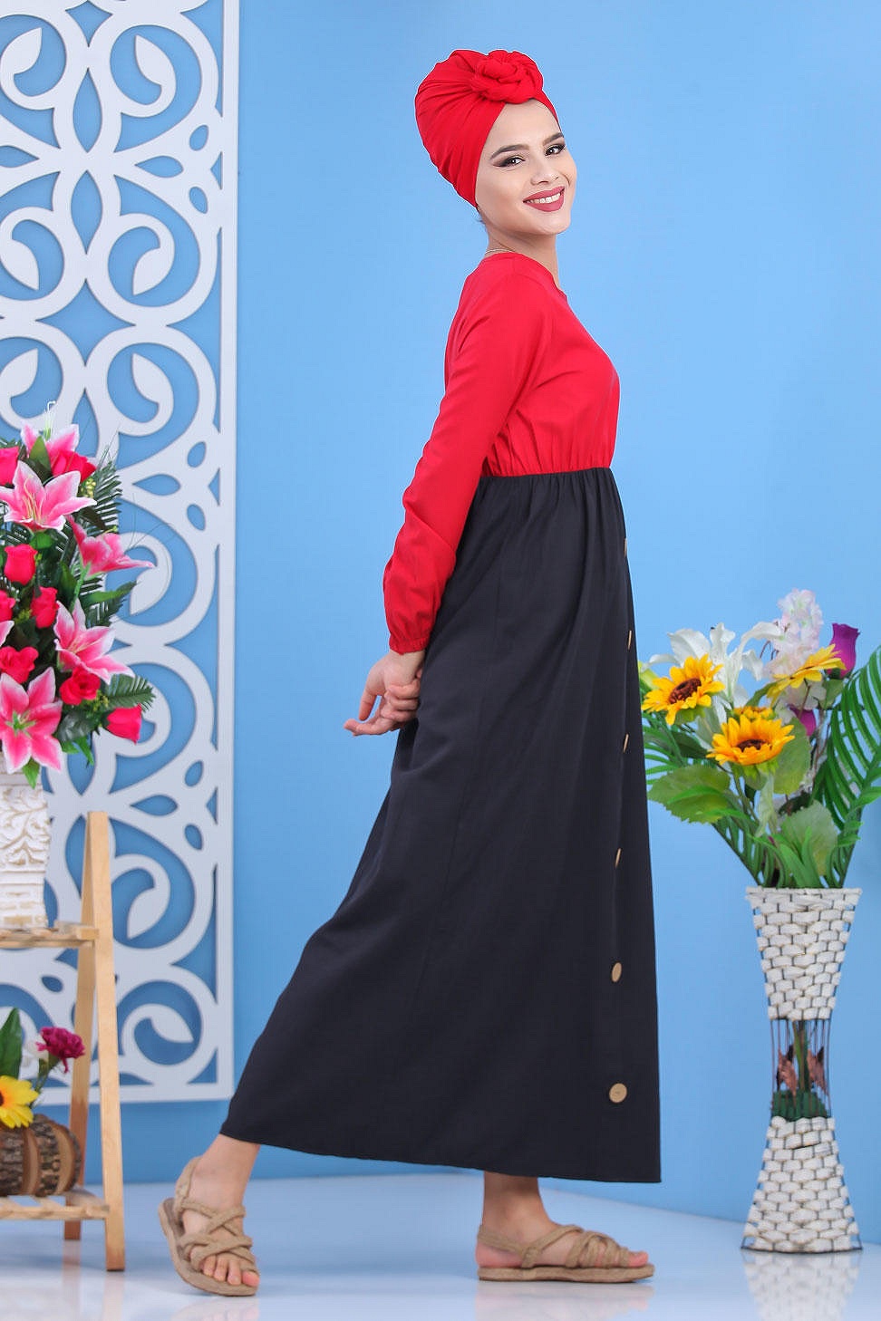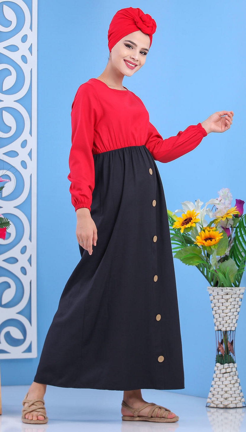 Robe longue bicolore a boutons pour femme - Couleur rouge coquelicot
