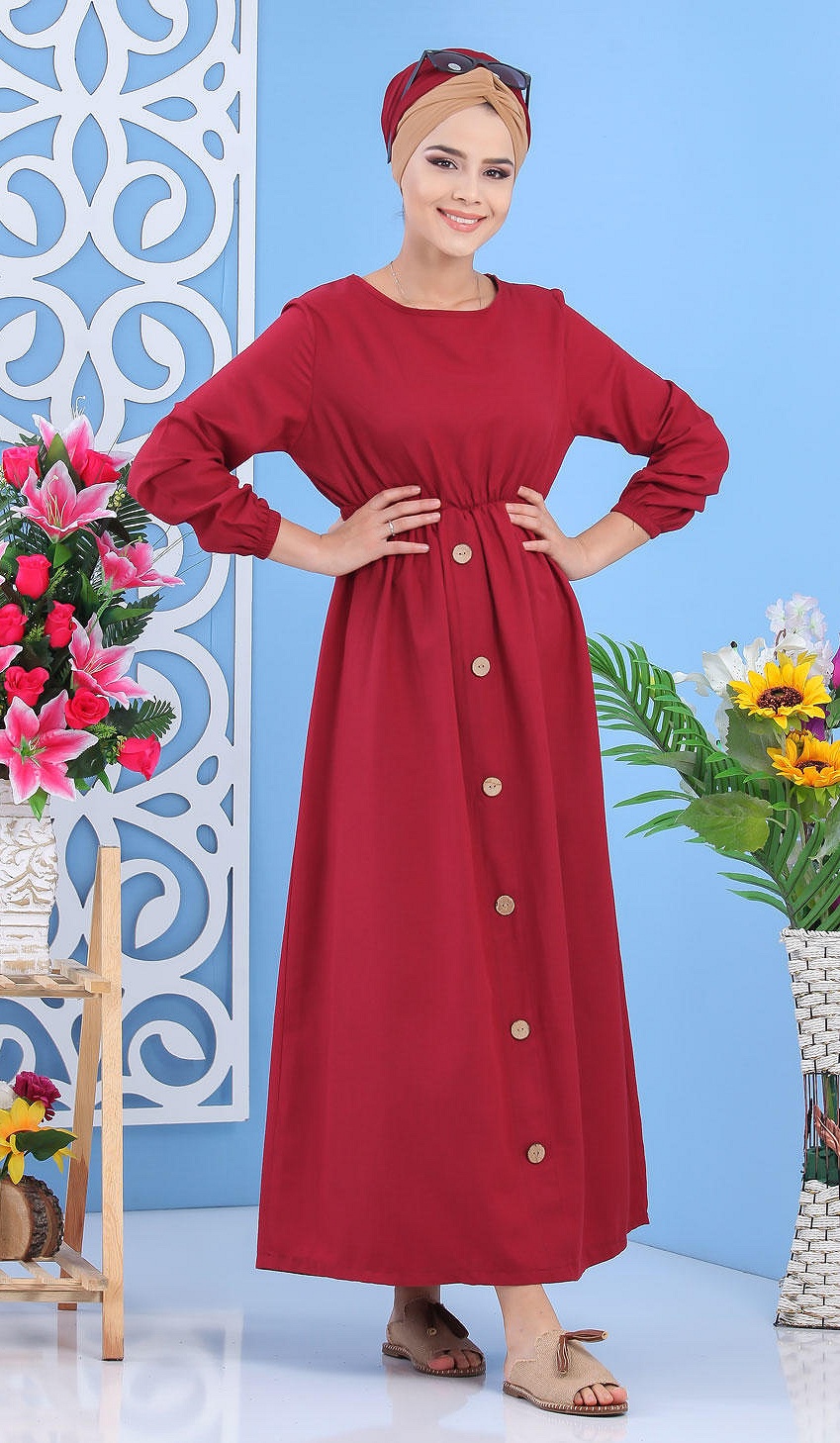 Robe longue cintree decoration boutons - Couleur grenat (Mode chic et moderne grande taille pour femme)