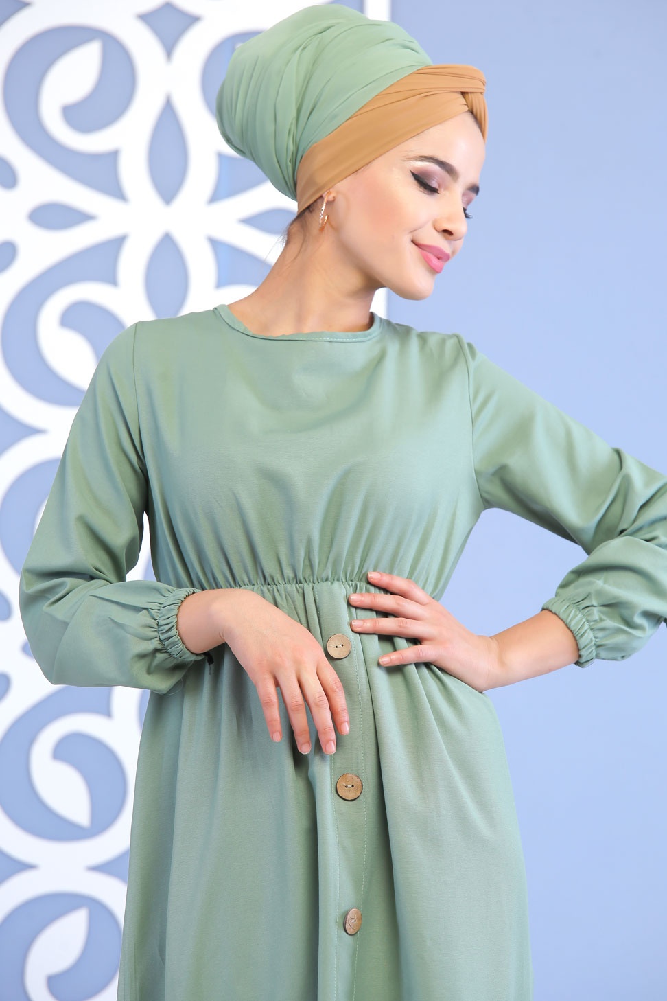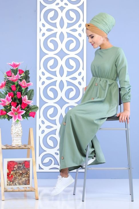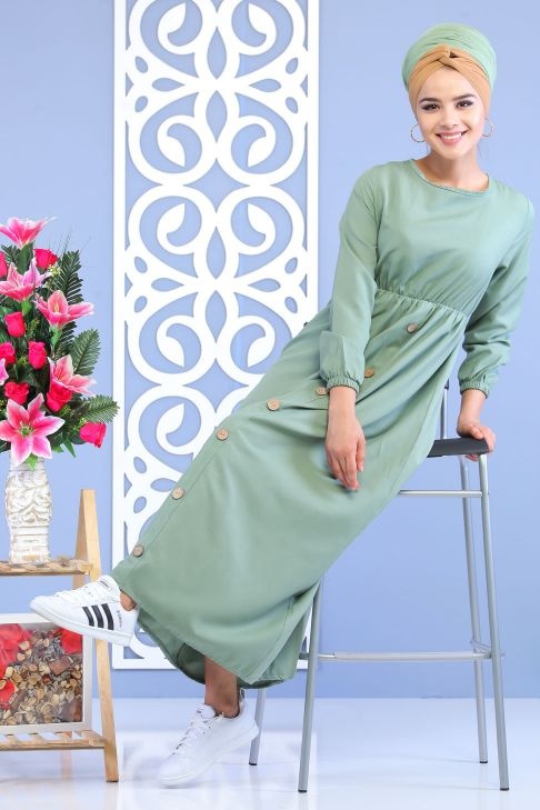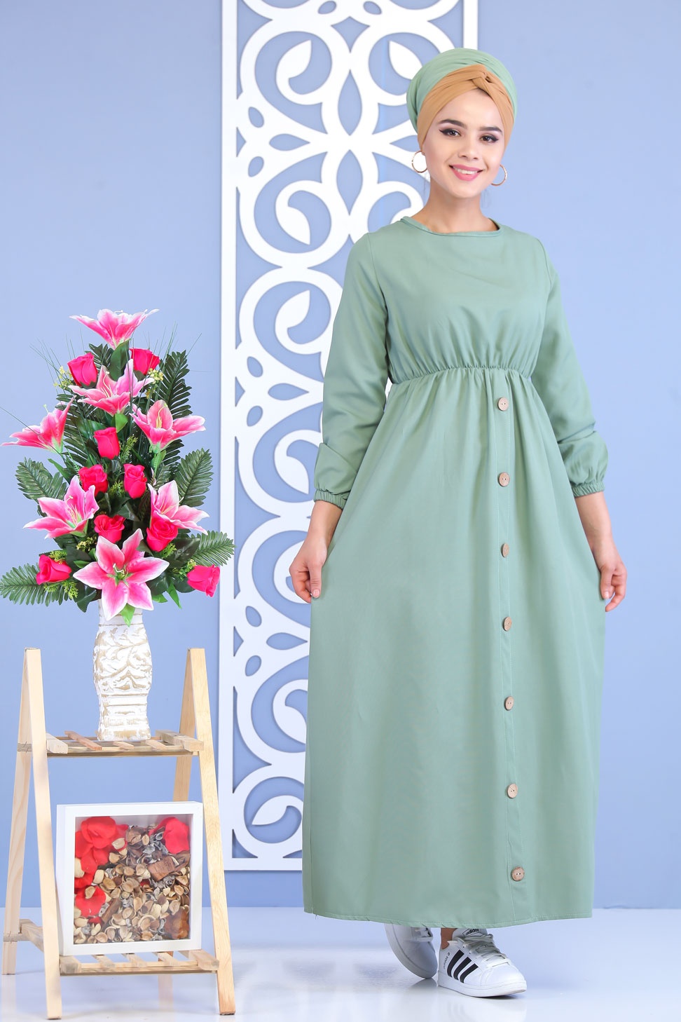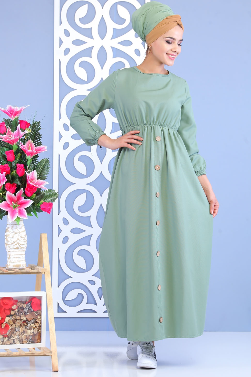 Robe longue cintrée décoration boutons pour femme - Couleur vert amande Vetement & Accessoire