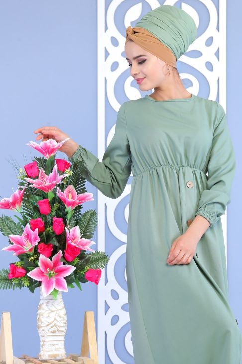 Robe longue cintree decoration boutons pour femme - Couleur vert amande