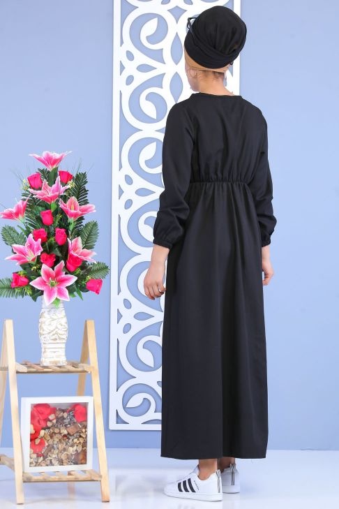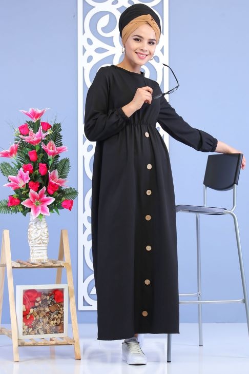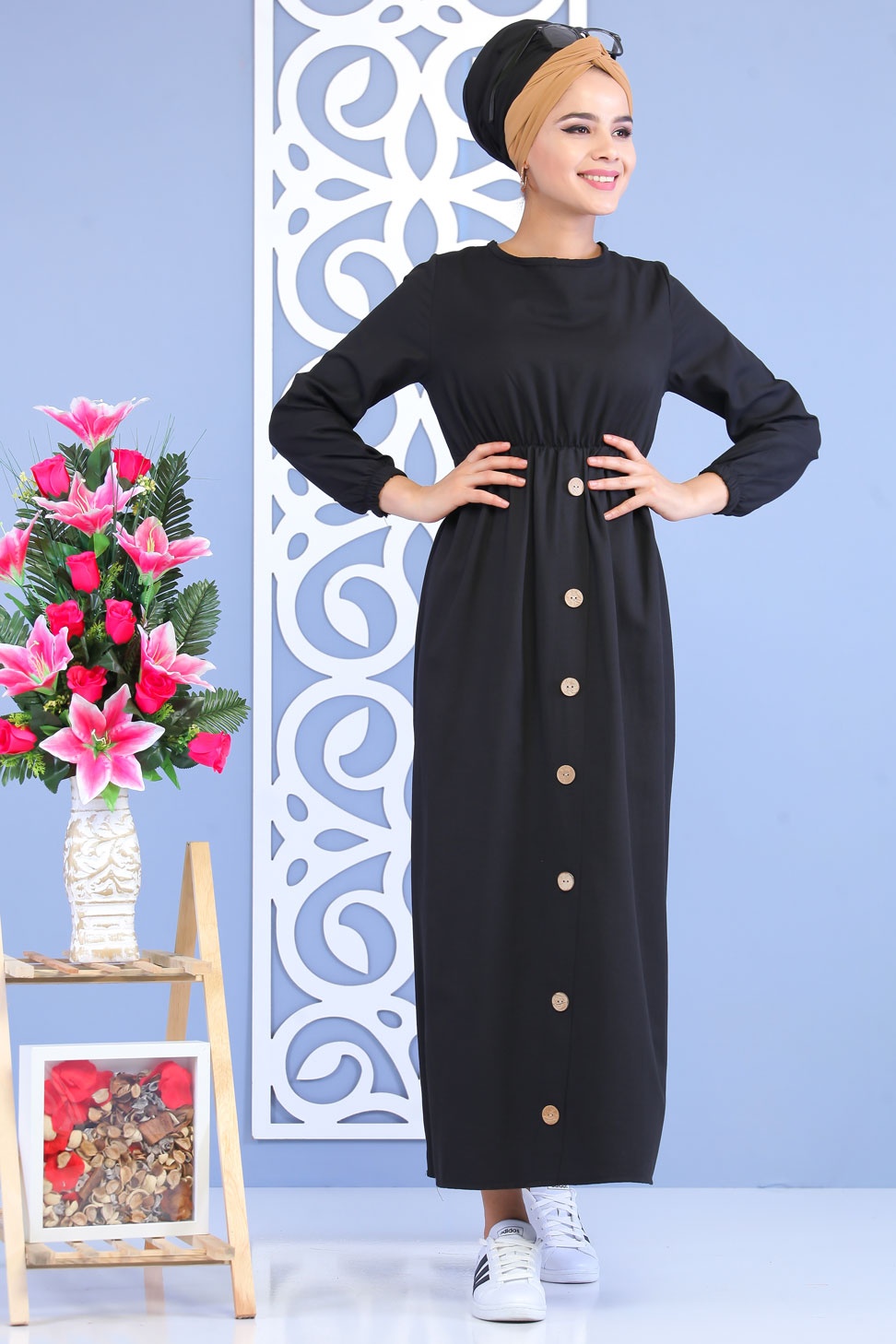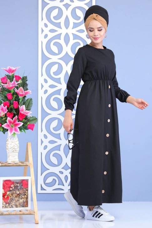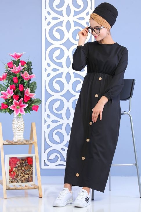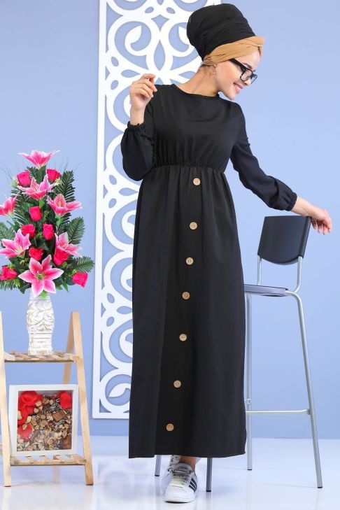 Robe longue cintree decoration boutons pour femme - Couleur noire