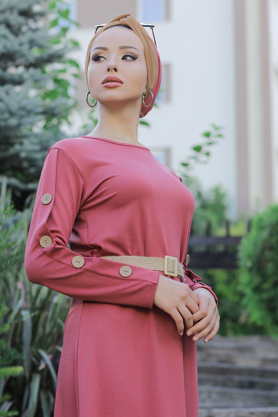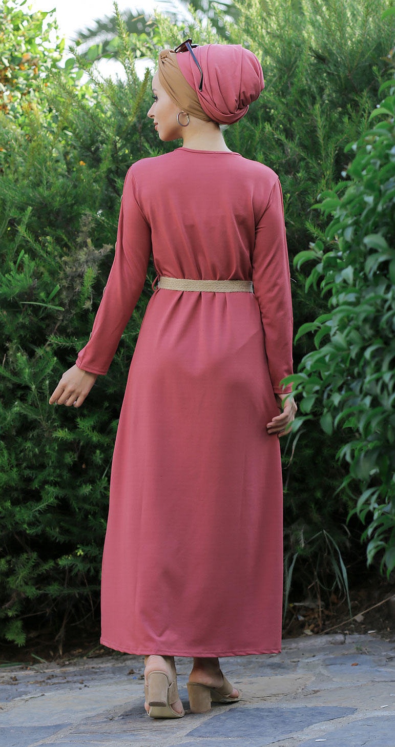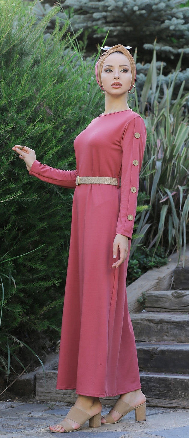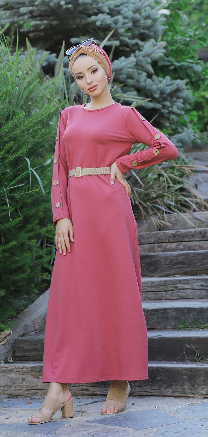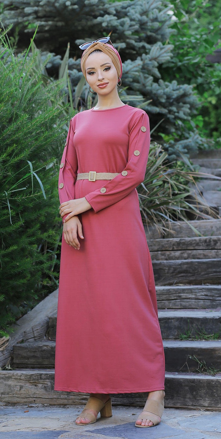 Robe longue, coupe droite, col rond, ceinture tissé à passants, manches avec décoration boutons, tissu effet crêpe. Ce modèle sobre et classique s'adapte pour diverses occasions et en toute saison.