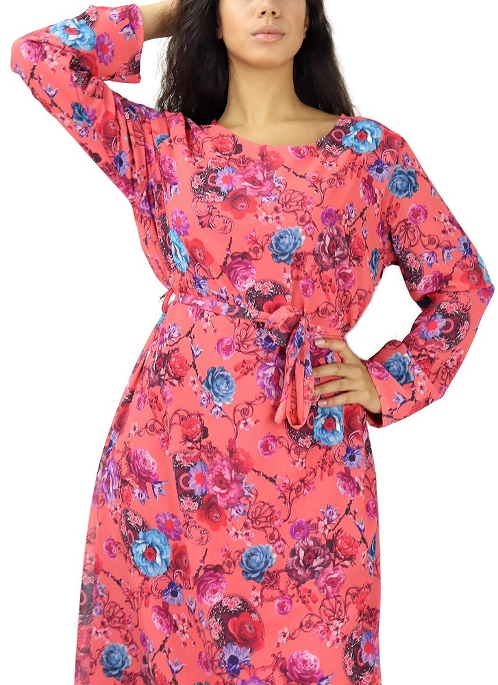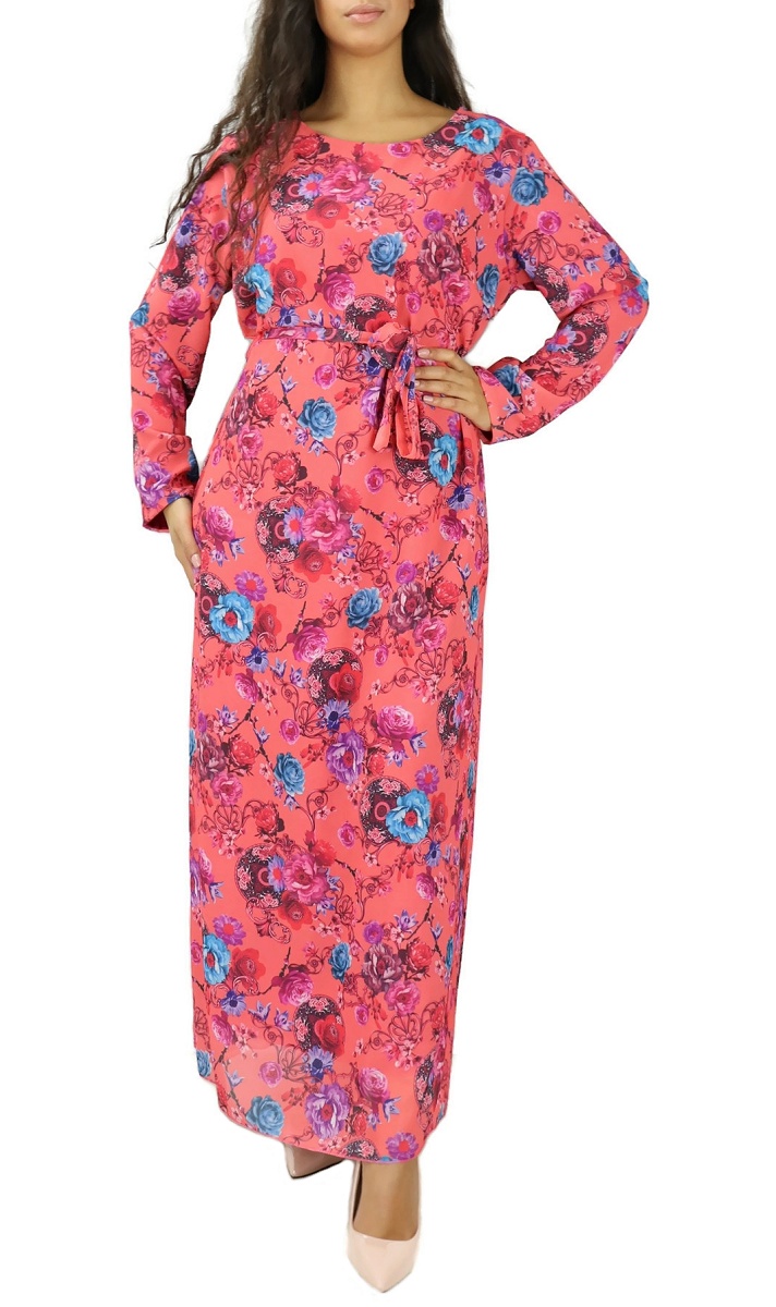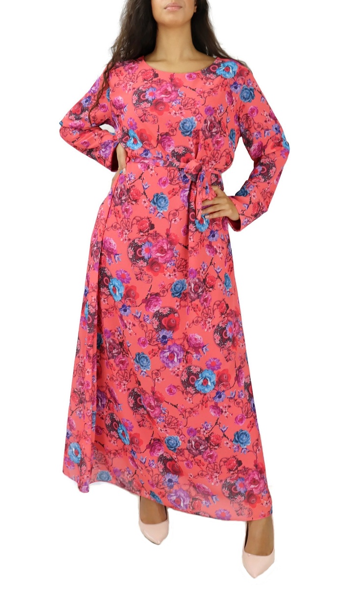Robe longue évasée à motifs fleurs (Vente en ligne vetement femme musulmane) - Couleur rouge - REF. 32782 (28.00 €)