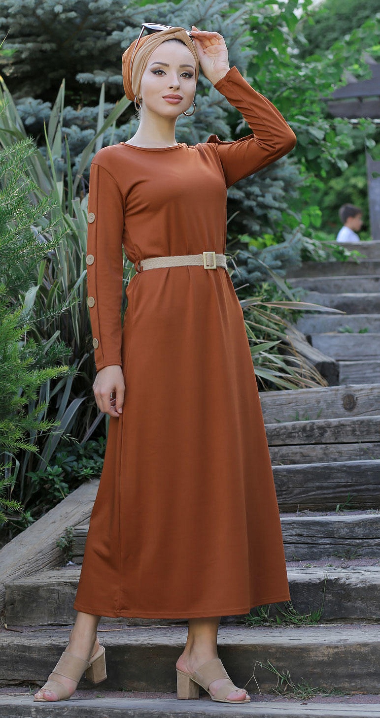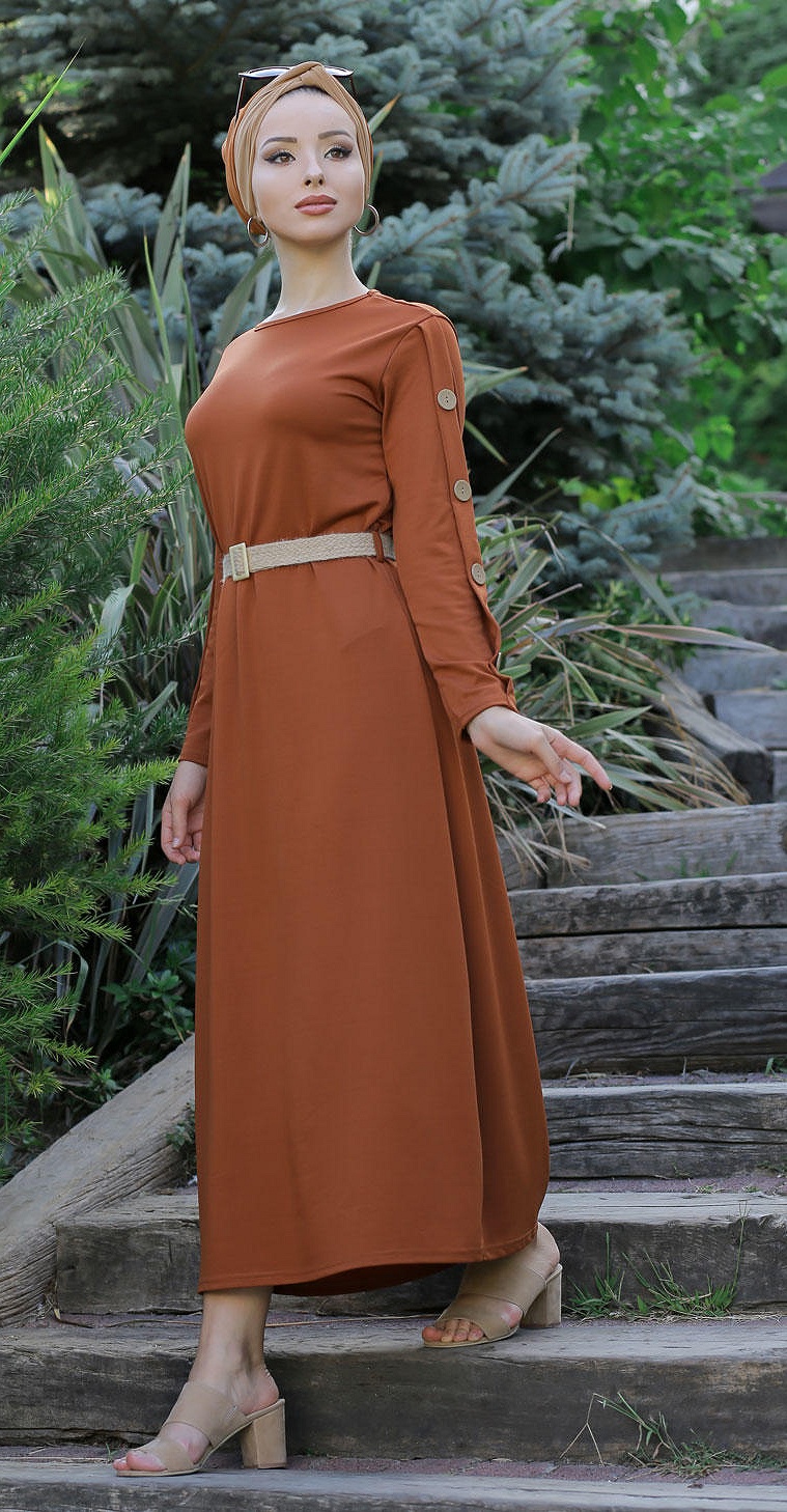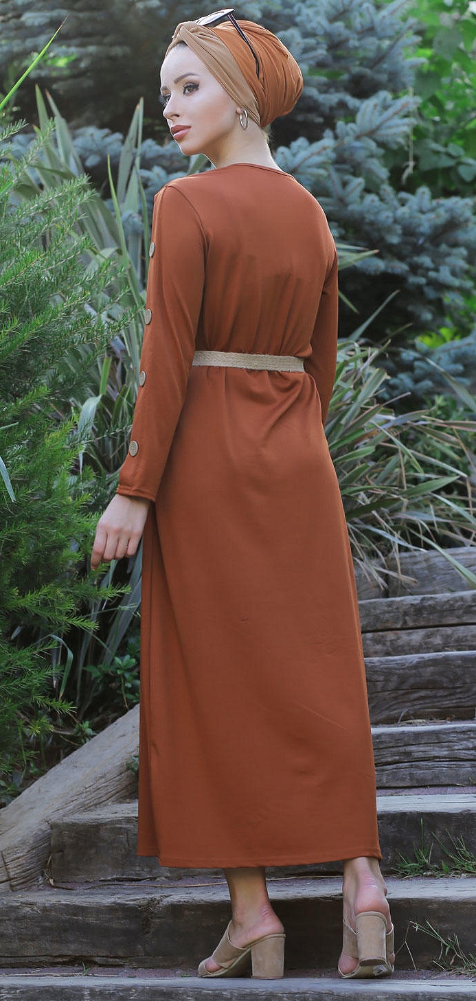Robe de ville longue decoration boutons pour femme - Couleur rouille
