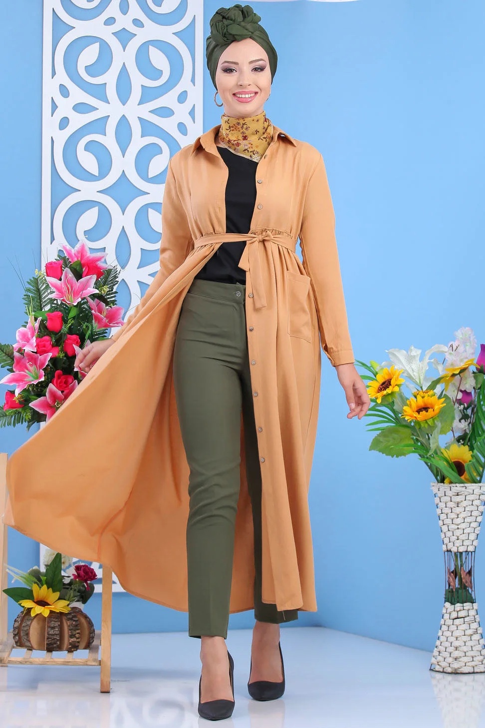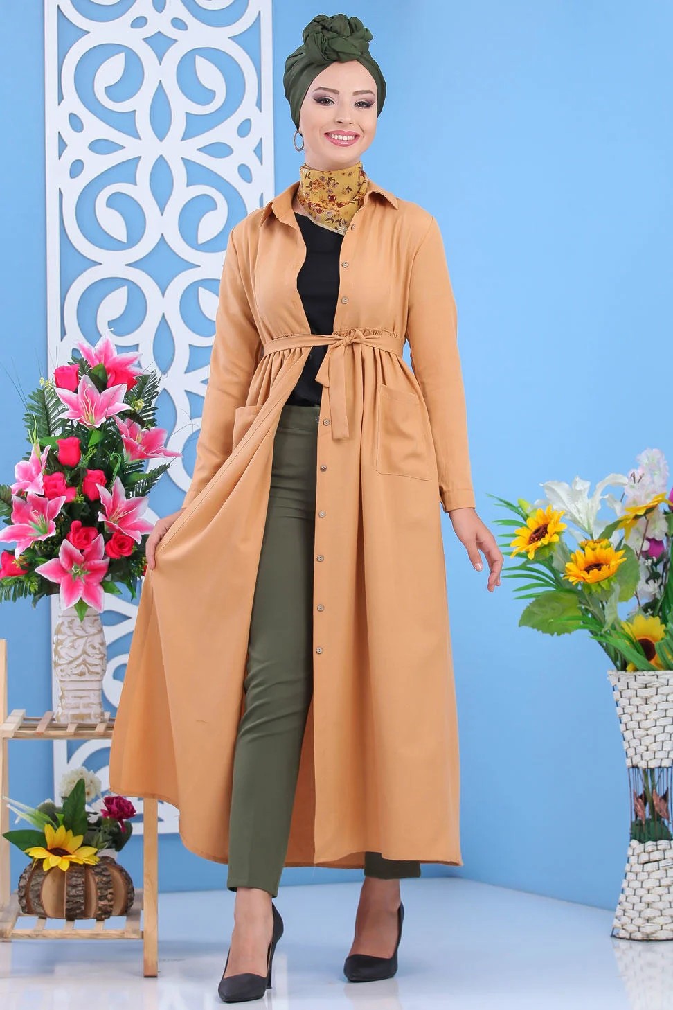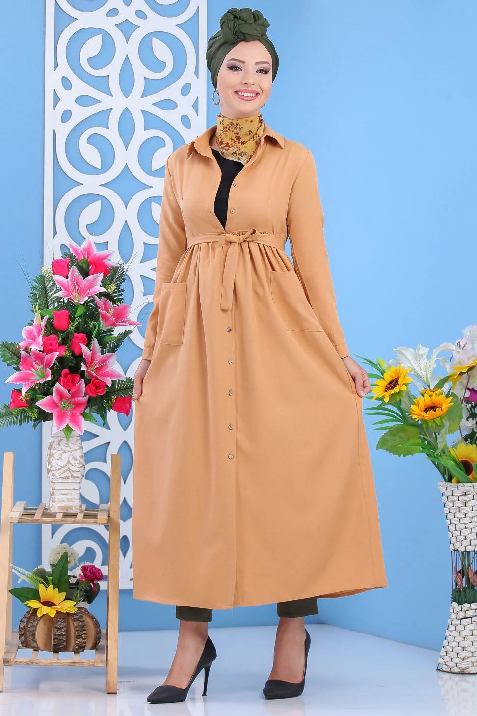 Robe boutonnée avec ceinture assortie pour femme (Tenue de ville chic pour hijab) - Couleur beige - REF. 35860 (26.90 €) - En Promotion à 20.90 €
