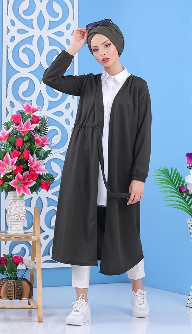 Veste longue classique boutonnée élégante (Vêtement Hijab pour femme voilée) - Couleur kaki