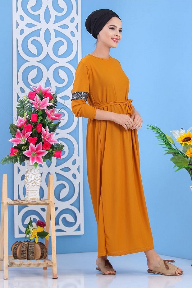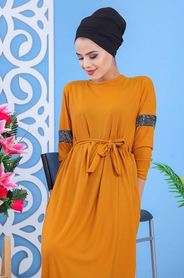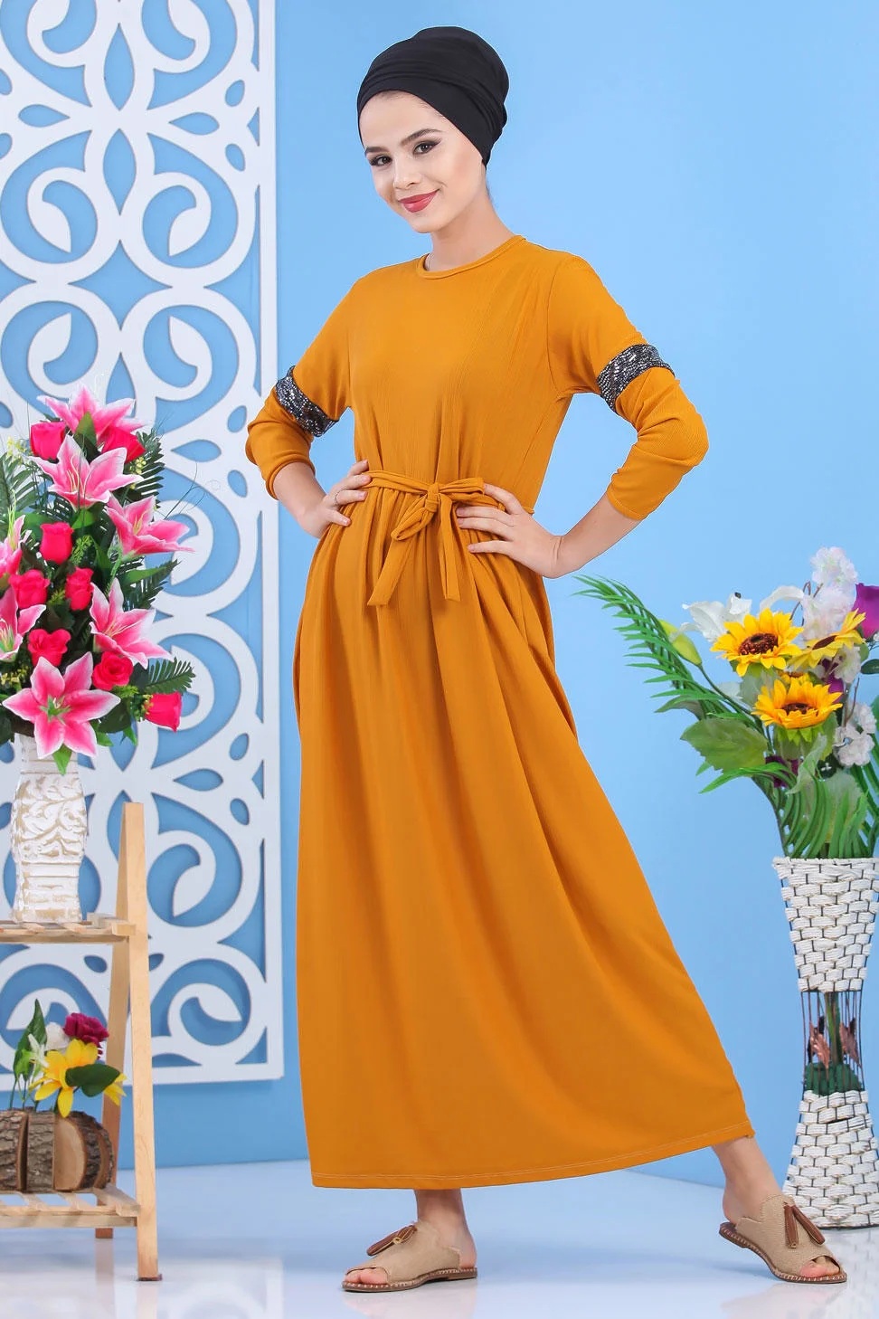Robe longue décontractée chic à strass pour femme - Couleur jaune moutarde Vetement & Accessoire