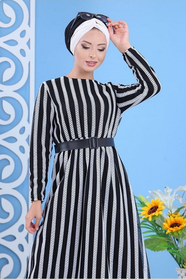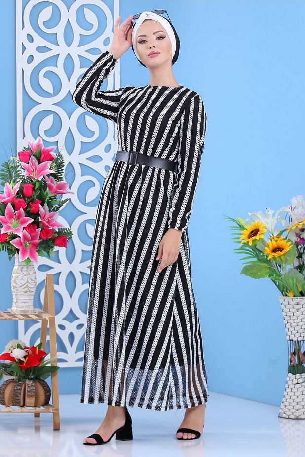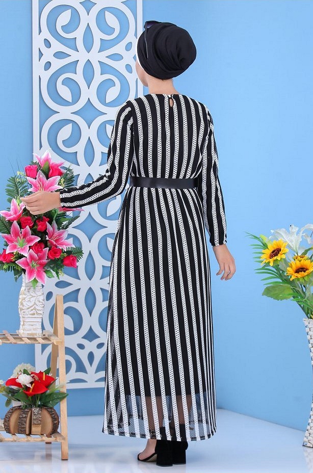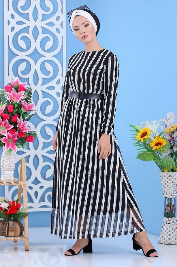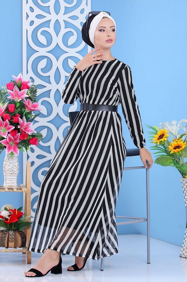 Robe longue, col rond, manches longues finition élastiques aux poignets, taille cintrée par un élastique, ceinture ajustable, entièrement doublée de l'intérieur, tissu de type brodé, bien que classique ce modèle reste une valeur sûre.